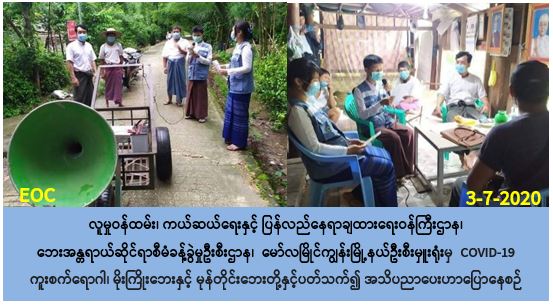 လူမှုဝန်ထမ်း၊ ကယ်ဆယ်ရေးနှင့် ပြန်လည်နေရာချထားရေးဝန်ကြီးဌာန၊ ဘေးအန္တရာယ်ဆိုင်ရာ စီမံခန့်ခွဲမှုဦးစီးဌာန၊ မော်လမြိုင်ကျွန်းမြို့နယ်ဦးစီးမှူးရုံးမှ တာဝန်ရှိသူများသည် အထွေထွေ အုပ်ချုပ်ရေးဦးစီးဌာနနှင့် အတူပူးပေါင်း၍ (၃-၇-၂၀၂၀)ရက်နေ့၊ (၀၈း၀၀)နာရီအချိန်မှ (၁၂း၀၀)နာရီ အချိန်ထိ မော်လမြိုင်ကျွန်းမြို့နယ်၊ ထိန်ကုလားကျေးရွာအုပ်စုအတွင်းရှိ ဘီလူးကျွန်းကျေးရွာနှင့် ထိန်ကုလားကျေးရွာတို့အတွင်း ပြည်သူများအား Covid-19 ကူးစက်ရောဂါ အသိပညာပေးခြင်း၊ မိုးကြိုးဘေး/ မုန်တိုင်းဘေး အန္တရာယ်အသိပညာပေးခြင်းနှင့် လက်ကမ်းစာစောင်ဝေငှခြင်းများဆောင်ရွက်ခဲ့ကြောင်း သိရှိရပါသည်။