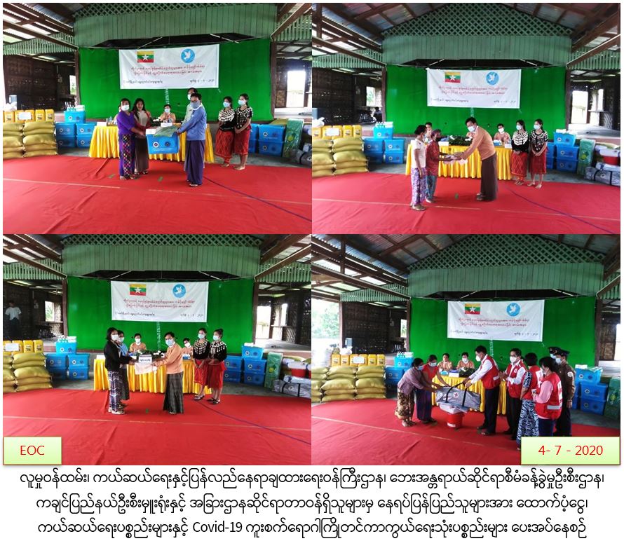 လူမှုဝန်ထမ်းကယ်ဆယ်ရေးနှင့်ပြန်လည်နေရာချထားရေးဝန်ကြီးဌာန၊ ဘေးအန္တရာယ်ဆိုင်ရာစီမံခန့်ခွဲမှုဦးစီးဌာန၊ ကချင်ပြည်နယ်ဦးစီးမှူးရုံးမှ တာဝန်ရှိသူများသည် (၄-၇-၂၀၂၀)ရက်နေ့ (၁၀:၀၀)နာရီအချိန်တွင် ကချင်ပြည်နယ်အစိုးရအဖွဲ့ဝင် စည်ပင်သာယာရေးဝန်ကြီးဌာနဝန်ကြီး၊ လမ်းပန်းဆက်သွယ်ရေး၊ လျှက်စစ်နှင့်စက်မှုလက်မှုဝန်ကြီးဌာနဝန်ကြီး၊ ဝိုင်းမော်မြို့နယ်ပြည်သူ့လွှတ်တော်ကိုယ်စားလှယ်၊ အမျိုးသားလွှတ်တော်ကိုယ်စားလှယ်တို့နှင့်အတူလိုက်ပါလျှက် မြစ်ကြီးနားမြို့၊ စီတာပူဆွတ်ငိုင်တောင်စခန်းမှ ဝိုင်းမော်မြို့နယ်၊ ရွှေညောင်ပင်ကျေးရွာသို့ပြောင်းရွှေ့နေထိုင်သော နေရပ်ပြန်အိမ်ထောင်စု(၁၀)စုအား စားနပ်ရိက္ခာ(၃)လစာ၊ ဆန်(၅၇အိတ်၊၄ပြည်၊၄ဘူး)၊ ဆီ(၆၀)ပိဿာ၊ ပဲ(၆၀)ပိဿာ၊ ဆား(၃၀)ပိဿာ၊ တန်ဖိုး(၂,၁၂၂,၁၂၅ိ/-)၊ ပြောင်းရွှေ့စရိတ် တစ်အိမ်ထောင်လျှင်(၁၀၀၀၀၀°/-)နှုန်းနှင့် (၁၀)အိမ်ထောင်စုစာ(၁,၀၀၀,၀၀၀°/-) ၊ ကယ်ဆယ်ရေးပစ္စည်း(၁၇)မျိုးအားပေးအပ်ခဲ့ပြီး၊ အဆိုပါနေရပ်ပြန်ပြည်သူများအတွက် ကချင်နှစ်ခြင်းခရစ်ယာန်အဖွဲ့ချုပ်(KBC)သည် နီပွန်ဖောင်ဒေရှင်းမှ လှူဒါန်းသော အလှူငွေများထဲမှ အိမ်တစ်လုံးလျှင်(၅၅)သိန်းနှုန်းဖြင့် (၁၀)လုံးအားလည်းကောင်း၊ ရေဘုံဘိုင်တွင်း(၁)တွင်းလျှင်(၅)သိန်းနှုန်းဖြင့်စုစုပေါင်း(၁၀)တွင်းအားလည်းကောင်း၊ ရေချိုးခန်းနှင့် အိမ်သာ(၁)လုံးလျှင်(၉)သိန်းနှုန်းဖြင့်(၁၀)လုံးအားလည်းကောင်း၊ မြန်မာနိုင်ငံကြက်ခြေနီအသင်းမှ (၁၁၅,၀၀၀°/-)တန်ဖိုးရှိ Family Kit Set (၁)ပုံးစီနှင့် (၃၅,၀၀၀°/-)တန်ဖိုးရှိ Hygiene Kit Set (၁)ပုံးစီအားလည်းကောင်း၊ UNDP အဖွဲ့အစည်းမှ (၆၀,၀၀၀°/-)တန်ဖိုးရှိ Tissue လိပ်များအားလည်းကောင်း၊ မြစ်ကြီးနားခရိုင်အထွေထွေအုပ်ချုပ်ရေးဦးစီးဌာနမှ Covid -19 ထိန်းချုပ်ကာကွယ်ရေးသုံးပစ္စည်းများဖြစ်သော Surgicar Mask နှင့် လက်သန့်ဆေးဘူးများအားလည်းကောင်း ထောက်ပံ့ပေးအပ်ခဲ့ကြောင်း သတင်းရရှိပါသည်။