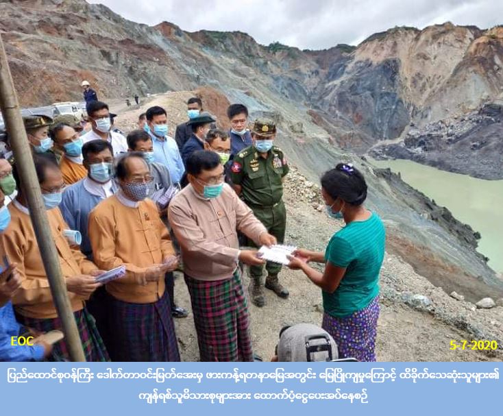 ဆက်လက်၍ ဥက္ကဌနှင့် အဖွဲ့ဝင်များသည် တာဝန်ရှိသူများလိုက်ပါလျက် ဝှေခါတိုက်နယ် ဆေးရုံတွင် မြေပြိုကျမှုဖြစ်စဉ်ကြောင့် တက်ရောက်ဆေးကုသမှုခံယူလျက်ရှိသော ဒဏ်ရာရ လူနာ (၁၂)ဦးအား နှစ်သိမ့်အားပေးစကားများပြောကြားခဲ့ကြပြီး အမျိုးသားသဘာဝဘေး အန္တရာယ်ဆိုင်ရာ စီမံခန့်ခွဲမှုကော်မတီ၊ လူမှုဝန်ထမ်း၊ ကယ်ဆယ်ရေးနှင့် ပြန်လည်နေရာချထားရေးဝန်ကြီးဌာနနှင့် ကချင်ပြည်နယ်အစိုးရအဖွဲ့က ထောက်ပံ့ငွေများ ပေးအပ်ခဲ့ကြပါသည်။ ထို့အပြင် မြန်မာနိုင်ငံ ကျောက်မျက်လုပ်ငန်းရှင်များအသင်းချုပ်နှင့် မြန်မာသူရကျောက်မျက်ရတနာကုမ္ပဏီတို့မှ တာဝန်ရှိ သူများကလည်း ဒဏ်ရာရ လူနာများအတွက် ထောက်ပံ့ငွေများပေးအပ်ခဲ့ကြပါသည်။