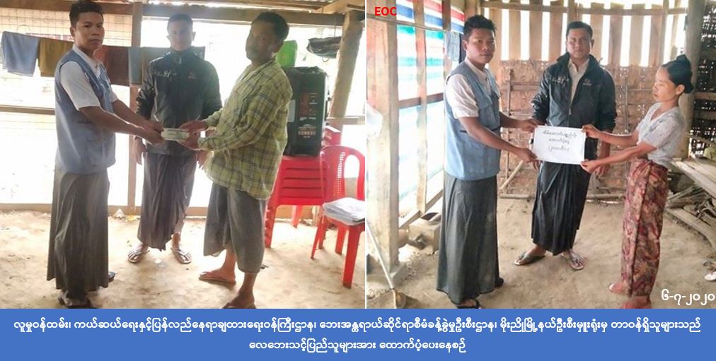 လူမှုဝန်ထမ်း၊ ကယ်ဆယ်ရေးနှင့် ပြန်လည်နေရာချထားရေးဝန်ကြီးဌာန၊ ဘေးအန္တရာယ်ဆိုင်ရာ စီမံခန့်ခွဲမှု ဦးစီးဌာန၊ မိုးညိုမြို့နယ်ဦးစီးမှူးရုံးမှ တာဝန်ရှိသူများသည် (၆-၇-၂၀၂၀)ရက်နေ့၊ (၀၄:၀၀)နာရီအချိန်၌ ပဲခူးတိုင်းဒေသကြီး၊ သာယာဝတီခရိုင်၊ မိုးညိုမြို့နယ်၊ အင်းတ္တော်လုပ်ကျေးရွာအုပ်စု၊ အင်းတ္တော် လုပ်ကျေးရွာနှင့် မကျီးကုန်းကျေးရွာတို့တွင် ဖြစ်ပွားခဲ့သော လေဘေးကြောင့် အမိုးလန်နေအိမ် (၂) လုံး အတွက် အိမ်ဆောက်ပစ္စည်းဖိုးထောက်ပံ့ငွေ (၂၀,၀၀၀) ကျပ်ကို (၆-၇-၂၀၂၀) ရက်နေ့ (၁၅:၃၀) နာရီ အချိန်တွင် လေဘေးသင့်နေအိမ်၌ ကျေးရွာအုပ်ချုပ်ရေးမှူးနှင့်အတူ ပြည်သူလက်ဝယ်အရောက် သွားရောက်ထောက်ပံ့ပေးအပ်ခဲ့ကြောင်း သိရှိရပါသည်။