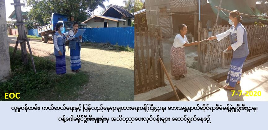 လူမှုဝန်ထမ်း၊ ကယ်ဆယ်ရေးနှင့် ပြန်လည်နေရာချထားရေး၀န်ကြီးဌာန၊ ဘေးအန္တရာယ်ဆိုင်ရာ စီမံခန့်ခွဲမှုဦးစီးဌာန၊ ဂန့်ဂေါခရိုင်ဦးစီးမှူးရုံးမှ တာဝန်ရှိသူများသည် (၇-၇-၂၀၂၀) ရက်နေ့၊ (ဝ၇:၀၀) နာရီမှ (၁၁:၀၀) နာရီအချိန်ထိ ဂန့်ဂေါမြို့နယ်၊ စည်ပင်သာယာရပ်ကွက်တွင် Covid-19 ရောဂါ ကြိုတင်ကာကွယ်ရေးနှင့် မိုးရာသီတွင်ဖြစ်ပွားလေ့ရှိသည့် မိုးကြိုးဘေးနှင့် လေပြင်းဘေး အန္တရာယ်များ ကြိုတင်ပြင်ဆင်ရေး အသိပညာပေးနိုးဆော်ခြင်းများကို Hand Speaker အသုံးပြု ၍ ဆောင်ရွက်ခဲ့ပြီး လက်ကမ်းစာစောင်များဖြန့်ဝေခဲ့ပါကြောင်း သတင်းရရှိပါသည်။