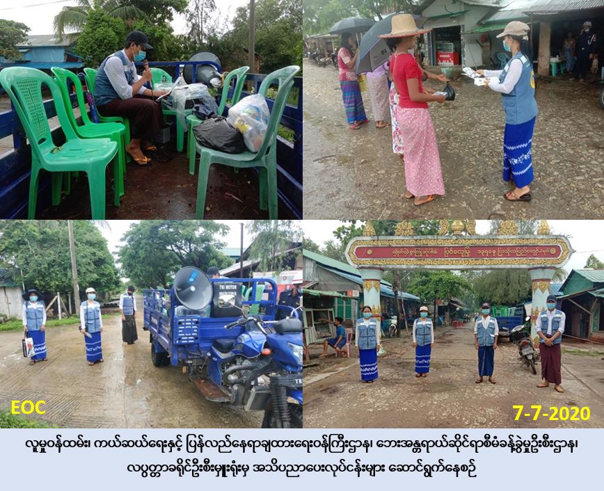 လူမှုဝန်ထမ်း၊ ကယ်ဆယ်ရေးနှင့် ပြန်လည်နေရာချထားရေး၀န်ကြီးဌာန၊ ဘေးအန္တရာယ်ဆိုင်ရာ စီမံခန့်ခွဲမှုဦးစီးဌာန၊ လပွတ္တာခရိုင်ဦးစီးမှူးရုံးမှ တာဝန်ရှိသူများသည် အထွေထွေအုပ်ချုပ်ရေး ဦးစီးဌာနနှင့်အတူပူးပေါင်း၍ (၇-၇-၂၀၂၀)ရက်နေ့၊ (၀၉:၃၀)နာရီအချိန်မှ(၁၁:၃၀)နာရီအချိန်ထိ လပွတ္တာမြို့နယ်၊ ပြင်စလူမြို့အတွင်းရှိ ၊ ရပ်ကွက်(၁၊၂၊၃)နှင့် အောင်လှိုင်ကျေးရွာများတွင် Covid-19 အသက်ရှူလမ်းကြောင်းဆိုင်ရာရောဂါနှင့် ပတ်သက်၍ ကျန်းမာရေးနှင့်အားကစား ၀န်ကြီးဌာနမှ ထုတ်ပြန်ထားသည့် အသိပေးကြေညာချက်များ၊ သဘာဝဘေးအန္တရာယ်ဆိုင်ရာ အသိပညာပေးခြင်းများကို အများပြည်သူများသိရှိလိုက်နာရန် Loud Speaker ဖြင့်လှည့်လှည်၍ အသိပညာပေးခြင်း၊ လက်ကမ်းစာစောင်များဝေငှခြင်းများကို ပြုလုပ်ဆောင်ရွက်ခဲ့ကြောင်း သတင်းရရှိပါသည်။