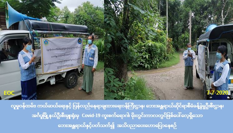 လူမှုဝန်ထမ်း၊ ကယ်ဆယ်ရေးနှင့် ပြန်လည်နေရာချထားရေးဝန်ကြီးဌာန၊ ဘေးအန္တရာယ်ဆိုင်ရာ စီမံခန့်ခွဲမှုဦးစီးဌာန၊ အင်္ဂပူမြို့နယ်ဦးစီးမှူးရုံးမှ တာဝန်ရှိသူများသည် အထွေထွေအုပ်ချုပ်ရေးဦးစီးဌာနနှင့်ပူးပေါင်း၍ (၇-၇-၂၀၂၀) ရက်နေ့တွင် ထန်းပင်ကန်ကျေးရွာအုပ်စုရှိ လယ်ဦးကျေးရွာ၊ အင်ကြင်းကုန်းကျေးရွာ၊ ဂျမ်းကုန်းကျေးရွာ၊မှော်တောကုန်းကျေးရွာ၊ မကျီးကုန်းကျေးရွာအုပ်စုရှိ ကျီးပေါက်ကုန်းကျေးရွာ၊ကျောင်းကုန်းကျေးရွာ၊ ဂျမ်းကုန်းကျေးရွာ၊ ကမ်းနားရွာသစ်ကျေးရွာ၊ သပြေကုန်းကျေးရွာ၊ ပုစွန်တောင်ကုန်းကျေးရွာ၊ မှော်တောကုန်းကျေးရွာများ၌ Covid-19 ရောဂါနှင့်ပတ်သက်၍ကာကွယ်၊ တားဆီး၊ ထိန်းချုပ်၊ ကုသရေးဆိုင်ရာ အသိပညာပေး ဆောင်ရန်ရှောင်ရန်အချက်အလက်များနှင့် မိုးတွင်းကာလဖြစ်ပွာသောဘေးအန္တရယ်များနှင် ပတ်သက်၍ ဆောင်ရန်ရှောင်ရန်များကို ပြည်သူများအလွယ်တကူသိရှိလိုက်နာနိုင်ရေးအတွက် လှည့်လည်၍ အသံချဲ့စက်ဖြင့် အသိပေးနှိုးဆော်ခြင်းလုပ်ငန်းများအား ဆောင်ရွက်ခဲ့ပါကြောင်း သတင်းရရှိပါသည်။