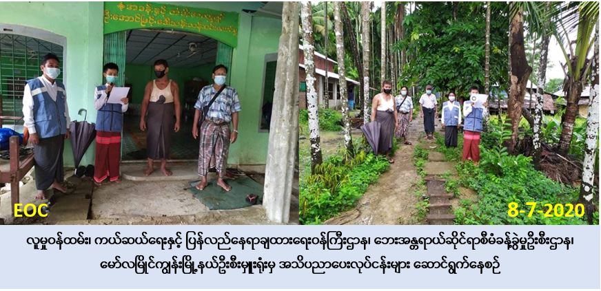 လူမှုဝန်ထမ်း၊ ကယ်ဆယ်ရေးနှင့် ပြန်လည်နေရာချထားရေး၀န်ကြီးဌာန၊ ဘေးအန္တရာယ်ဆိုင်ရာ စီမံခန့်ခွဲမှုဦးစီးဌာန၊ မော်လမြိုင်ကျွန်းမြို့နယ်ဦးစီးမှူးရုံးမှ တာဝန်ရှိသူများသည် အထွေထွေ အုပ်ချုပ်ရေးဦးစီးဌာနနှင့်အတူပူးပေါင်း၍ (၈-၇-၂၀၂၀)ရက်နေ့၊ (၀၉:၀၀)နာရီအချိန်မှ (၁၂:၀၀) နာရီအချိန်ထိ မော်လမြိုင်ကျွန်းမြို့နယ်၊ ဝါးနက်ချောင်းကျေးရွာအုပ်စုအတွင်းရှိ ဝါးနက်ချောင်း ကျေးရွာ၊ ငှက်တော်ကျေးရွာ၊ ကညင်ချောင်းကျေးရွာနှင့် တံခွန်တိုင်လေးကျေးရွာအတွင်းရှိ ပြည်သူများအား Covid-19 ကူးစက်ရောဂါနှင့်ပတ်သက်၍ အသိပညာပေးခြင်း၊ မိုးကြိုးဘေး/ မုန်တိုင်းဘေး အန္တရာယ်အသိပညာပေးခြင်းနှင့် လက်ကမ်းစာစောင်ဝေငှခြင်းများ ဆောင်ရွက် ခဲ့ကြောင်း သတင်းရရှိပါသည်။
