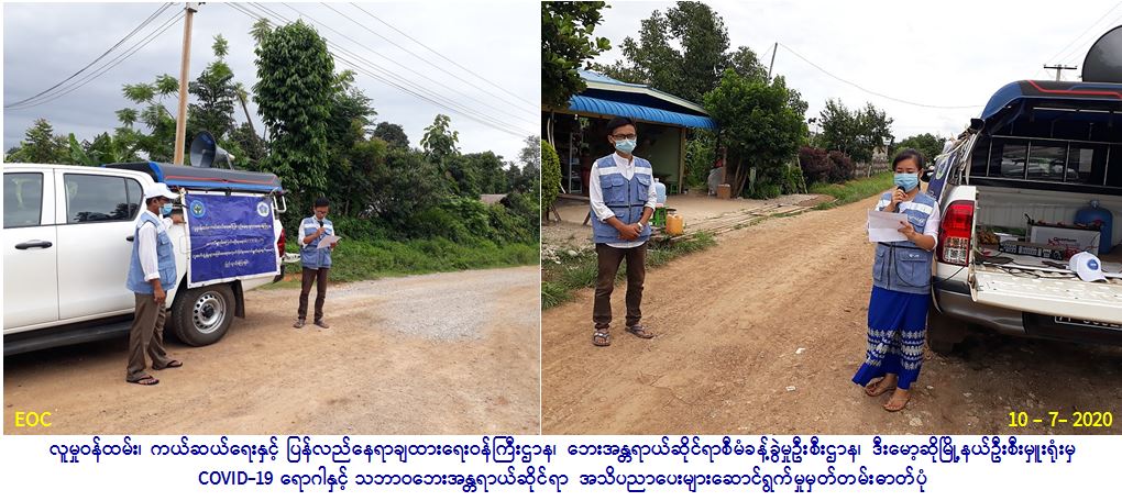 လူမှုဝန်ထမ်း၊ ကယ်ဆယ်ရေးနှင့်ပြန်လည်နေရာချထားရေးဝန်ကြီးဌာန၊ ဘေးအန္တရာယ်ဆိုင်ရာစီမံခန့်ခွမှုဦးစီးဌာန၊ ဒီးမော့ဆို မြို့နယ်ဦးစီးမှူးရုံးမှ တာဝန်ရှိသူများသည် (၁၀.၇.၂၀၂၀) ရက်နေ့တွင် လွိုင်ကော်မြို့နယ်၊ မထောခူကျေးရွာအုပ်စု၊ ဇရပ်ဖြူကျေးရွာ၊ ပိုးစာခြံကျေးရွာ၊ လောပိတစံပြကျေးရွာ၊ သတ္တပလူကျေးရွာနှင့် လောပိတကျေးရွာအုပ်စု၊ မိုက်ကန်းကျေးရွာများရှိ ပြည်သူများအား COVID-19 ကူးစက်ရောဂါပြန့်ပွားမှုမဖြစ်ပွားစေရန်အတွက် သိရှိလိုက်နာရန်အချက်များနှင့် သဘာဝဘေးအန္တရာယ်ဆိုင်ရာ ဆောင်ရန်၊ ရှောင်ရန်များ အသိပညာပေးဆောင်ရွက်ခဲ့ပါကြောင်း သတင်းရရှိပါသည်။