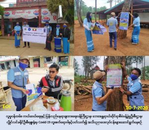 လူမှုဝန်ထမ်း၊ ကယ်ဆယ်ရေးနှင့် ပြန်လည်နေရာချထားရေး၀န်ကြီးဌာန၊ ဘေးအန္တရာယ်ဆိုင်ရာ စီမံခန့်ခွဲမှုဦးစီးဌာန၊ လွိုင်လင်ခရိုင်ဦးစီးမှူးရုံးမှ တာဝန်ရှိသူများသည် (၁၀-၇-၂၀၂၀)ရက်နေ့တွင် လူမှုဝန်ထမ်းဦးစီးဌာန၊ UNDP၊ unicefနှင့် စေတနာ့ဝန်ထမ်းတို့ ပူးပေါင်းပြီး အုပ်စု(၂)ဖွဲ့ခွဲ၍ လွိုင်လင်ခရိုင်၊ လွိုင်လင်မြို့နယ်၊ ခိုင်သဇင်စားသောက်ဆိုင်၊ သီပေါ-ပန်ကေတု လမ်းမပေါ်ရှိ ခရီးသွားပြည်သူများနှင့် လွိုင်လင်မြို့နယ်၊ ပင်လုံမြို့ လဝန်းသစ်စားသောက်ဆိုင်နှင့် သဘာဝ ရိပ် သာ သီလရှင်ကျောင်းရှိ သီလရှင်များက်ို Covid-19 ရောဂါကူးစက်မှု ဒုတိယလှိုင်း မဖြစ်ပွားစေရန်ကြိုတင်ကာကွယ်ရေး အသိပညာပေး ကမ်ပိန်းပြုလုပ်ခြင်း၊ ကျန်းမာရေးနှင့် အားကစား ဝန်ကြီးဌာန၏ ကမ္ဘာတစ်ဝှမ်း ရောဂါဖြစ်ပွားမှုအခြေအနေများကို သိရှိစေရန် ပြည်သူများအနေ ဖြင့် ဆောင်ရန်/ ရှောင်ရန်များကို ဟောပြောခြင်း၊ UNDP တံဆိပ်ပါနှာခေါင်းစည်း ၊ဆပ်ပြာခဲ၊ ပညာပေးလက်ကမ်းစာစောင်၊ လက်စွဲအိတ်များကို ပေးဝေခဲ့ပြီး မိမိကစကာကွယ်ပါ ၊ နေ့စဉ်ဘဝ မှာခပ်ခွါခွါနေပါ စသည့် ပညာပေးပိုစတာများ ၊ ဗွီနိုင်းများကိုရှမ်း ၊ မြန်မာ(၂)ဘာသာဖြင့် ပုံနှိပ် ထားသော ပိုစတာများဖြန့်ဝေပေးခဲ့ကြောင်း သတင်းရရှိပါသည်။