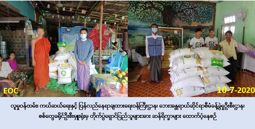 လူမှုဝန်ထမ်း၊ ကယ်ဆယ်ရေးနှင့် ပြန်လည်နေရာချထားရေး၀န်ကြီးဌာန၊ ဘေးအန္တရာယ်ဆိုင်ရာ စီမံခန့်ခွဲမှုဦးစီးဌာန၊ စစ်တွေခရိုင်ဦးစီးမှူးရုံးမှ တာဝန်ရှိသူများသည် ရခိုင်ပြည်နယ်အတွင်း တိုက်ပွဲ များဖြစ်ပွားမှုကြောင့် နေရပ်စွန့်ခွာ၍ ထပ်တိုးရောက်ရှိခိုလှုံနေထိုင်လျက်ရှိသည့် စစ်တွေမြို့နယ် အတွင်းရှိ တိုက်ပွဲရှောင်စုရပ် (၁၂)ခုမှ စုစုပေါင်း တိုက်ပွဲရှောင်အိမ်ထောင်စု(၂၁၉)စု၊ လူဦးရေ (၉၅၉) ဦးတို့အတွက် ဆန်ရိက္ခာ(၂)ပတ်စာ ဆန်(၁၃၉) အိတ်၊ (၂၀) ပြည်၊ (၄) ဗူးအား (၁၀-၇-၂၀၂၀) ရက်နေ့တွင် ထောက်ပံ့ပေးအပ်ခဲ့ကြောင်း သတင်းရရှိပါသည်။