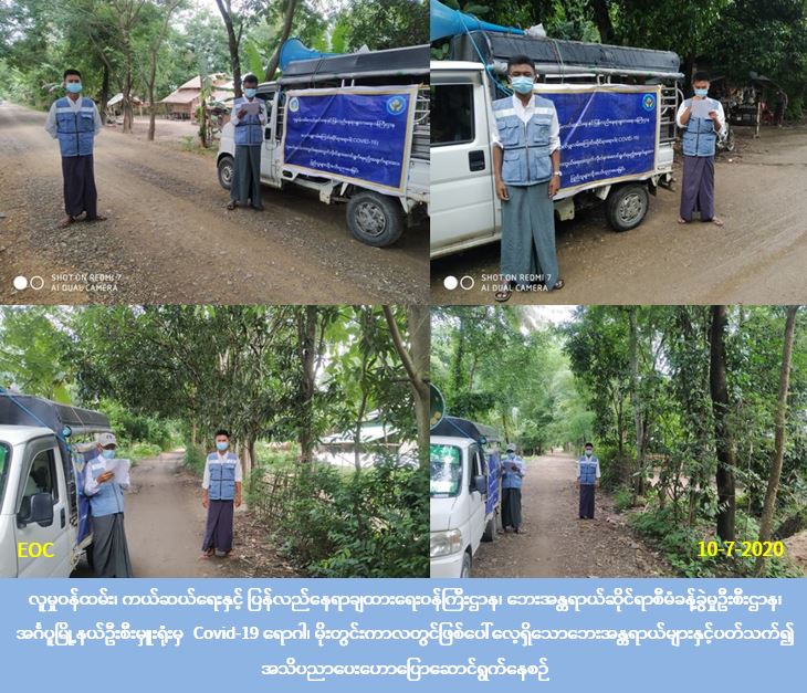 လူမှုဝန်ထမ်း၊ ကယ်ဆယ်ရေးနှင့် ပြန်လည်နေရာချထားရေးဝန်ကြီးဌာန၊ ဘေးအန္တရာယ်ဆိုင်ရာ စီမံခန့်ခွဲမှုဦးစီးဌာန၊ အင်္ဂပူမြို့နယ်ဦးစီးမှူးရုံးမှ တာဝန်ရှိသူများသည် အထွေထွေအုပ်ချုပ်ရေးဦးစီးဌာနနှင့်ပူးပေါင်း၍ (၁၀-၇-၂၀၂၀) ရက်နေ့တွင် သက္ကပြင်(မဲ) ကျေးရွာအုပ်စုရှိ သက္ကယ်ပြင်(အရှေ့)ကျေးရွာ၊နွားခြံကုန်းကျေးရွာ၊ မိုးခေါင်ကွင်းကျေးရွာ၊ ရွာသစ်ကုန်းကျေးရွာ၊ ရွှေတောင်တန်းကျေးရွာ၊ ပျဥ်ထောင်ကွင်းကျေးရွာ၊ သင်ဇာလီကျေးရွာ၊သက္ကယ်ပြင်အနောက်ကျေးရွာ၊ ကျွန်းတောကုန်းကျေးရွာများ၊ အင်ပင်ကုန်းကျေးရွာအုပ်စုရှိ ကွမ်းခြံကုန်းကျေးရွာ၊ အုန်းတောစုကျေးရွာ၊ ဝက်သတ်ကုန်းကျေးရွာ၊ ကံဒုတ်ကျေးရွာ၊ သာယာကုန်းကျေးရွာ၊ ချင်းကုန်းကျေးရွာ၊ ဒိုးကုန်းကျေးရွာ၊ ငါးဖယ်တူ(တောင်)ကျေးရွာ၊ ငါးဖယ်တူ(အလယ်)ကျေးရွာ၊ ငါးဖယ်တူ(မြောက်)ကျေးရွာ၊ ကမ်းနားတန်းကျေးရွာများ၌ Covid-19 ရောဂါနှင့်ပတ်သက်၍ကာကွယ်၊ တားဆီး၊ ထိန်းချုပ်၊ ကုသရေးဆိုင်ရာ အသိပညာပေး ဆောင်ရန်ရှောင်ရန်အချက်အလက်များနှင့် မိုးတွင်းကာလဖြစ်ပွာသောဘေးအန္တရယ်များနှင် ပတ်သက်၍ေဆာင်ရန်/ရှောင်ရန်များကို ပြည်သူများ အလွယ်တကူသိရှိ လိုက်နာ နိုင်ရေးအတွက်လှည့်လည်၍ အသံချဲ့စက်ဖြင့် အသိပေးနှိုးဆော်ခြင်းလုပ်ငန်းများအား ဆောင်ရွက်ခဲ့ပါကြောင်း သတင်းရရှိပါသည်။