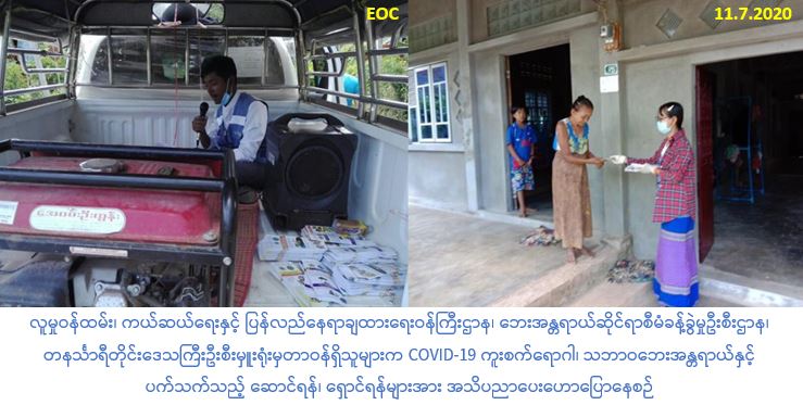 လူမှုဝန်ထမ်း၊ ကယ်ဆယ်ရေးနှင့် ပြန်လည်နေရာချထားရေးဝန်ကြီးဌာန၊ ဘေးအန္တရာယ်ဆိုင်ရာစီမံခန့်ခွဲမှုဦးစီးဌာန၊ တနင်္သာရီတိုင်းဒေသကြီးဦးစီးမှူးရုံးမှ တာဝန်ရှိသူများသည် (၁၁-၇-၂၀၂၀) ရက်နေ့တွင် ထားဝယ်မြို့နယ်အတွင်းရှိ ကျောက်မော်ရပ်ကွက်နှင့် ဗျောတောဝရပ်ကွက်တို့တွင် လော်စပီကာတို့ဖြင့် Covid-19 လတ်တရောဂါအသက်ရှုလမ်းကြောင်းဆိုင်ရာရောဂါနှင့် ပက်သက်၍ လိုက်နာဆောင်ရွက်ရမည့်အချက်များနှင့် မိုးရာသီကာလသို့ ရောက်ရှိလာပြီဖြစ်သည့် အတွက် ရေဘေး၊ မြေပြိုဘေးနှင့် မိုးကြိုးဘေးစသည့် သဘာဝဘေးအန္တရာယ်နှင့် ပက်သက်သည့်ဆောင်ရန်/ ရှောင်ရန် ပြည်သူသို့အသိပညာပေးပန်ကြားချက်များအား လှည့်လည် ကြေညာခြင်းများဆောင်ရွက်ခဲ့ပြီး လက်ကမ်းစာစောင်များဝေငှခဲ့ပါကြောင်း သတင်းရရှိပါသည်။