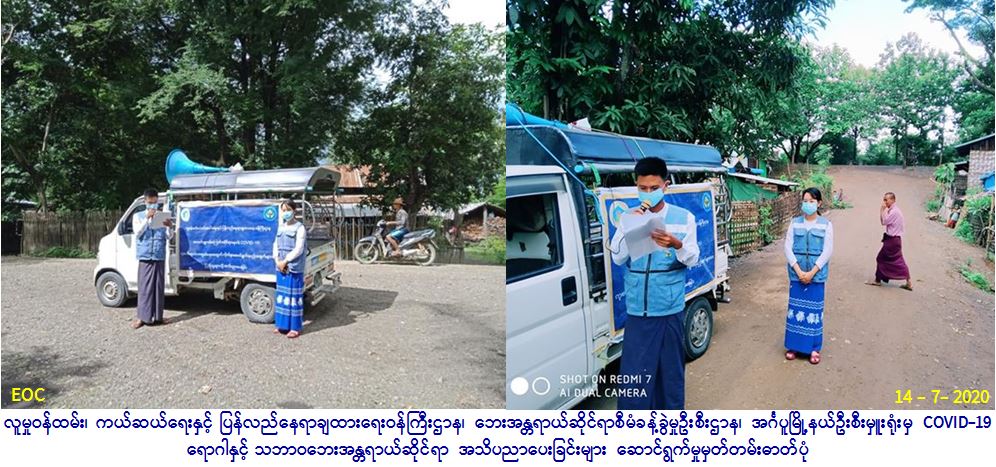 လူမှုဝန်ထမ်း၊ ကယ်ဆယ်ရေးနှင့်ပြန်လည်နေရာချထားရေးဝန်ကြီးဌာန၊ ဘေးအန္တရာယ်ဆိုင်ရာစီမံခန့်ခွဲမှုဦးစီးဌာန၊ အင်္ဂပူမြို့နယ် ဦးစီးမှူးရုံးမှ တာဝန်ရှိသူများသည် အထွေထွေအုပ်ချုပ်ရေးဦးစီးဌာနနှင့်ပူးပေါင်း၍ (၁၄-၇-၂၀၂၀) ရက်နေ့တွင်ခုံကြီးကျေးရွာ အုပ်စုရှိ ကျောက်ပြုတ်ကျေးရွာ၊ ကတူးပေါက်ကျေးရွာ၊ မြေရဲကွင်းကျေးရွာ၊ အုတ်ရှစ်ကုန်းကျေးရွာ၊ ကြီးကုန်းကျေးရွာ၊ ဂရက် ကျေးရွာ၊ တောင်ပေါ်ကုန်းကျေးရွာ၊ အုတ်ရှစ်ခါးကျေးရွာ၊ အေးမြကုန်း ကျေးရွာများ၊ ဘွက်ကျေးရွာအုပ်စုရှိ ကျွန်းတောကျေးရွာ၊ ဥယျာဉ်ကုန်းကျေးရွာ၊ ဘဲပြားကုန်းများကျေးရွာ၊ ကျောင်းကွင်း ကျေးရွာအုပ်စုရှိ အကျကွင်းကျေးရွာ၊ ကြပ်ကြီးကျေးရွာ၊ရွှေနိုင်ဝ ကျေးရွာများ၌ Covid-19 ရောဂါနှင့်ပတ်သက်၍ကာကွယ်၊ တားဆီး၊ ထိန်းချုပ်၊ ကုသရေးဆိုင်ရာ အသိပညာပေး ဆောင်ရန်/ ရှောင်ရန်အချက်အလက်များနှင့် မိုးတွင်းကာလဖြစ်ပွာသော ဘေးအန္တရယ်များနှင့်ပတ်သက်၍ ဆောင်ရန်/ရှောင်ရန်များကို ပြည်သူများ အလွယ်တကူသိရှိ လိုက်နာနိုင်ရေးအတွက် လှည့်လည်၍ အသံချဲ့စက်ဖြင့် အသိပေးနှိုးဆော်ခြင်းလုပ်ငန်းများ ဆောင်ရွက်ခဲ့ပါကြောင်း သတင်းရရှိပါသည်။