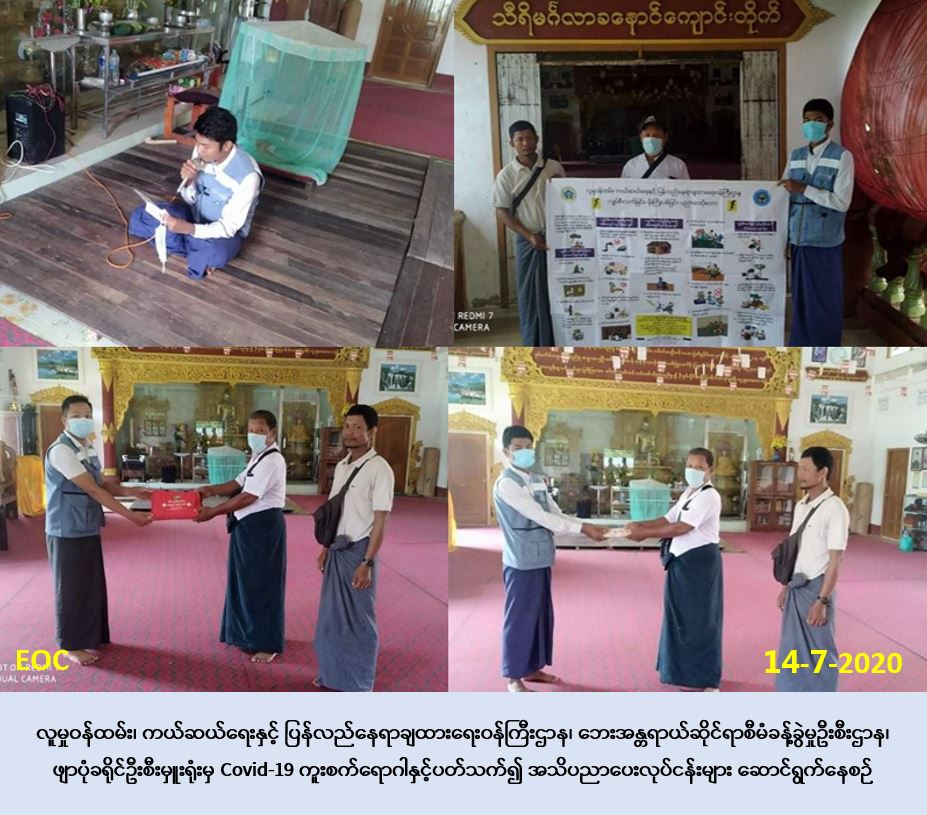 လူမှုဝန်ထမ်း၊ ကယ်ဆယ်ရေးနှင့် ပြန်လည်နေရာချထားရေး၀န်ကြီးဌာန၊ ဘေးအန္တရာယ်ဆိုင်ရာ စီမံခန့်ခွဲမှုဦးစီးဌာန၊ ဖျာပုံခရိုင်ဦးစီးမှူးရုံးမှ တာဝန်ရှိသူများသည် (၁၄-၇-၂၀၂၀) ရက်နေ့၊ နံနက် (၉:၃၀) နာရီအချိန်မှ ညနေ(၁၅:၃၀) နာရီအချိန်အထိ ပြည်သူများအား COVID-19 ရောဂါ ကူးစက်ပြန့်နှံ့မှုများ မဖြစ်ပွားစေရန်အတွက် သိရှိလိုက်နာဆောင်ရွက်ရမည့်အချက်များနှင့် ပတ် သက်၍ အသိပညာပေးခြင်းနှင့် မိုးကြိုးဘေးအသိပညာပေးဆောင်ရွက်မှုကို ဖျာပုံမြို့နယ်၊ ခနောင် ရှမ်းကွင်းကျေးရွာအုပ်စု၊ ခနောင်ရှမ်းကွင်းကျေးရွာ၊ ခနောင်ကျောင်းစုကျေးရွာ၊ ခနောင်ချောင်း တွင်းကျေးရွာရှိ ပြည်သူများသို့ ထိရောက်စွာ လိုက်လံအသိပေးဆောင်ရွက်ခဲ့ခြင်းနှင့် အသိပညာပေးဗီနိူင်းပေးအပ်ခဲ့ကြောင်း သတင်းရရှိပါသည်။
