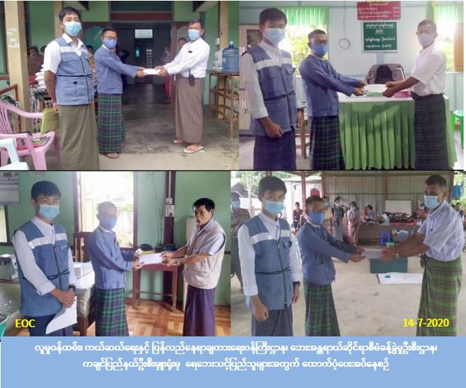 ဘေးအန္တရာယ်ဆိုင်ရာစီမံခန့်ခွဲမှုဦးစီးဌာန၊ ကချင်ပြည်နယ်ဦးစီးမှူးရုံးမှ တာဝန်ရှိသူများသည် မြစ်ကြီးနားမြို့ရှိ ကယ်ဆယ်ရေးစခန်း(၉)ခုမှ ရေဘေးရှောင်ပြည်သူများအတွက် ဆန်ရိက္ခာဖိုး (၁,၂၁၅,၉၀၀/-)ကို ယမန်နေ့တွင် သွားရောက်ထောက်ပံ့ခဲ့ပြီး ကယ်ဆယ်ရေးစခန်းများရှိ ရေဘေး ရှောင်ပြည်သူများအား COVID-19 ကူးစက်ရောဂါ ကာကွယ်ထိန်းချုပ်ရေးအတွက် ကျန်းမာရေးနှင့် အားကစားဝန်ကြီးဌာန၏ သတ်မှတ်ချက်များကို လိုက်နာဆောင်ရွက်ကြရန် အသိပညာပေး၍ အဝတ် Mask နှင့် ဆပ်ပြာတို့အား ဆက်လက်ဝေငှလျက်ရှိကြောင်း သတင်းရရှိပါသည်။