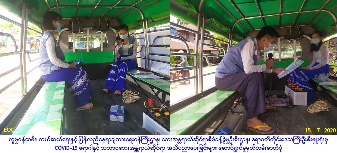လူမှုဝန်ထမ်း၊ ကယ်ဆယ်ရေးနှင့် ပြန်လည်နေရာချထားရေးဝန်ကြီး ဌာန၊ ဘေးအန္တရာယ်ဆိုင်ရာစီမံခန့်ခွဲမှုဦးစီးဌာန၊ ဧရာဝတီတိုင်း ဒေသကြီးဦးစီးမှူးရုံးမှ တာဝန်ရှိသူများသည် (၁၅-၇-၂၀၂၀) ရက်နေ့ (ဝ၈၃၀)နာရီအချိန်မှစ၍ ပုသိမ်မြို့၊ အမှတ် (၆)ရပ်ကွက်နှင့် အမှတ် (၇)ရပ်ကွက်တို့အတွင်း ကျန်းမာရေးနှင့်အားကစားဝန်ကြီးဌာနမှ ထုတ်ပြန်ထားသော Covid-19 ကူးစက်မှု ဒုတိယလှိုင်း မဖြစ်စေရန် အသိပညာပေးခြင်းလုပ်ငန်းများနှင့် ဧရာဝတီတိုင်းဒေသကြီး Covid – 19 ထိန်းချုပ်ရေးနှင့် အရေးပေါ်တုံ့ပြန်ရေး ကော်မတီမှ (၁၄-၇-၂၀၂၀) ရက်နေ့အထိ ထုတ်ပြန်ပြီးဖြစ်သည့် တားမြစ်မိန့်နှင့်ညွှန်ကြားချက်များ အားလည်းကောင်း၊ ရာသီ အလိုက်ဖြစ်ပွားတတ်သော သဘာဝဘေး များအန္တရာယ်များနှင့်ပတ်သက်သည့် သဘာဝဘေး အသိပညာပေးခြင်း တို့အား လည်းကောင်း၊ အများပြည်သူများသိရှိလိုက်နာရန် ကွင်းဆင်းလှည့်လည်၍ အသိပညာပေးလုပ်ငန်းများ ဆောင်ရွက်ခဲ့ ပါကြောင်း သတင်းရရှိပါသည်။