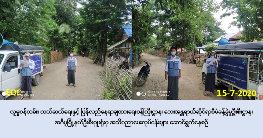 လူမှုဝန်ထမ်း၊ ကယ်ဆယ်ရေးနှင့် ပြန်လည်နေရာချထားရေး၀န်ကြီးဌာန၊ ဘေးအန္တရာယ်ဆိုင်ရာ စီမံခန့်ခွဲမှုဦးစီးဌာန၊ အင်္ဂပူမြို့နယ်ဦးစီးမှူးရုံးမှ တာဝန်ရှိသူများသည် (၁၅-၇-၂၀၂၀) ရက်နေ့တွင် အထွေထွေအုပ်ချုပ်ရေးဦးစီးဌာနနှင့် ပူးပေါင်း၍ စေတီခုံကျေးရွာအုပ်စုရှိ စေတီခုံကျေးရွာ၊ရှမ်းကွင်းကျေးရွာ၊ ကျောက်ကြီးမြှောင်ကျေးရွာ၊ ရွာသာကုန်းကျးရွာ၊ ငှက်ပျောတောကျေးရွာ၊ ထန်းပင်ကုန်းကျေးရွာ၊ မြေနီတောင်ကျေးရွာ၊ တူးမြောင်ကျေးရွာ၊ ဒေါင့်ကြီးကျေးရွာများ၊ လှည်း မှောက်ကျေးရွာအုပ်စုရှိ လှည်းမှောက်ကျေးရွာ၊ သပြေပင်ကျေးရွာ၊ ရေထွက်ခုံကျေးရွာ၊ စောပြာ ကျေးရွာကျေးရွာ၊ ကုန်းကြီးကျေးရွာ၊ မဲဇလီကျင်းကျေးရွာများ၌ Covid-19 ရောဂါနှင့်ပတ်သက် ၍ကာကွယ်၊ တားဆီး၊ ထိန်းချုပ်၊ ကုသရေးဆိုင်ရာ အသိပညာပေး ဆောင်ရန်/ရှောင်ရန်အချက် အလက်များနှင့် မိုးတွင်းကာလဖြစ်ပွာသော ဘေးအန္တရာယ်များနှင့် ပတ်သက်၍ ဆောင်ရန်/ ရှောင်ရန်များကို ပြည်သူများ အလွယ်တကူသိရှိ လိုက်နာနိုင်ရေးအတွက်လှည့်လည်၍ အသံ ချဲ့စက်ဖြင့် အသိပေးနှိုးဆော်ခြင်းလုပ်ငန်းများအား ဆောင်ရွက်ခဲ့ကြောင်း သတင်းရရှိပါသည်။