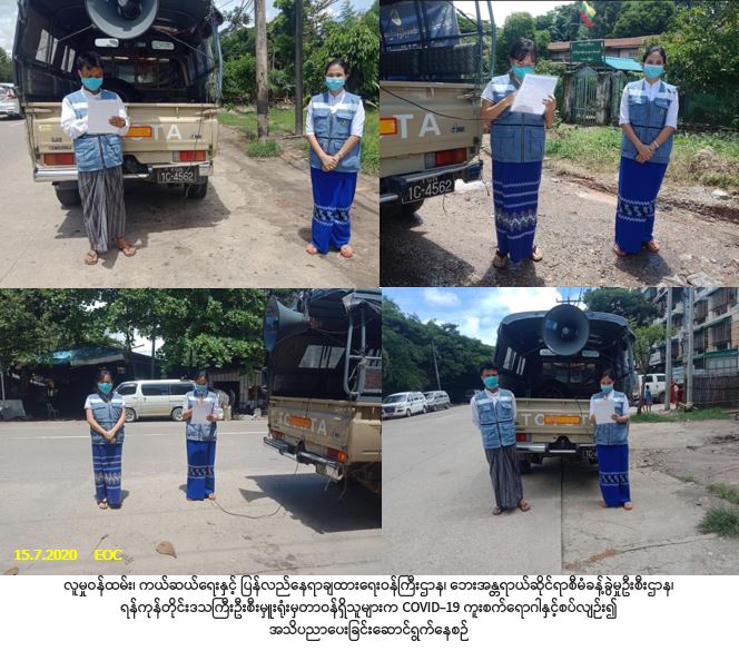 လူမှုဝန်ထမ်း၊ ကယ်ဆယ်ရေးနှင့် ပြန်လည်နေရာချထားရေးဝန်ကြီးဌာန၊ ဘေးအန္တရာယ်ဆိုင်ရာစီမံခန့်ခွဲမှုဦးစီး ဌာန၊ ရန်ကုန်တိုင်းဒေသကြီးဦးစီးမှူးရုံးမှတာဝန်ရှိသူများသည် (၁၅-၇-၂၀၂၀)ရက်နေ့တွင် ရန်ကုန်အရှေ့ပိုင်းခရိုင်၊ သာကေတမြို့နယ်၊ စက်မှုလက်မှုရပ်ကွက်၊ အမှတ် (၁) အနော်မာ၊ အမှတ် (၁) ထူပါရုံ၊ အမှတ် (၂) တောင်/မြောက် နှင့် အမှတ် (၃) ရန်ပြေရပ်ကွက်တို့၌ COVID-19 ကူးစက်ရောဂါနှင့်စပ်လျဉ်း၍ အများပြည်သူသိရှိလိုက်နာနိုင်ရန် ကျန်းမာရေးနှင့်အားကစားဝန်ကြီးဌာနမှ ထုတ်ပြန်ထားသည့် အသိပေးကြေညာချက်များ၊ မိုးကြိုးဘေးနှင့် စပ်လျဉ်း၍ ဦးစီးဌာနမှ ထုတ်ပြန်ထားသည့် လက်ကမ်းစာစောင်ပါအချက်အလက်များကို လှည့်လည်အသိပညာပေးနှိုးဆော်ခဲ့ပါကြောင်း သတင်းရရှိပါသည်။