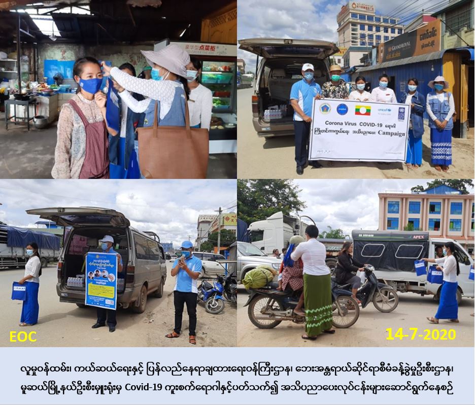 လူမှုဝန်ထမ်း၊ ကယ်ဆယ်ရေးနှင့် ပြန်လည်နေရာချထားရေး၀န်ကြီးဌာန၊ ဘေးအန္တရာယ်ဆိုင်ရာ စီမံခန့်ခွဲမှုဦးစီးဌာန၊ မူဆယ်မြို့နယ်ဦးစီးမှူးရုံးမှ တာဝန်ရှိသူများသည်(၁၄-၇-၂၀၂၀) ရက်နေ့တွင် လူမှုဝန်ထမ်းဦးစီးဌာန၊ UNDP၊ UNICEF၊ စေတနာပရဟိတအသင်းမှ Volunteer များ၊ အထွေထွေအုပ်ချုပ်ရေးဦးစီးဌာန၊ စွမ်စော်ရပ်ကွက်မှ တာဝန်ရှိသူများနှင့်ပူးပေါင်း၍ Covid-19 ရောဂါ ကူးစက်မှု ဒုတိယလှိုင်းမဖြစ်ပွားစေရန် Corona Virus Covid-19 ရောဂါကြိုတင်ကာကွယ်ရေးအသိပညာပေး Campaign အစီအစဥ်အား မူဆယ်မြို့နယ်၊ စွမ်စော်ရပ်ကွက်ရှိ မောခမ်းစားသောက်ဆိုင်နှင့်အနီးပတ်ဝန်းကျင်တွင် ပြည်သူများသို့အသိပညာပေးခြင်း၊ Mask ၊ ဆပ်ပြာ၊ လက်ကမ်းစာစောင်များပေးဝေခြင်း၊ အသံချဲ့စက်ဖြင့်နှိုးဆော်ခြင်းနှင့် ဗွီနိုင်း၊ ပိုစတာကပ်ခြင်းများ ဆောင်ရွက်ခဲ့ကြောင်း သတင်းရရှိပါသည်။
