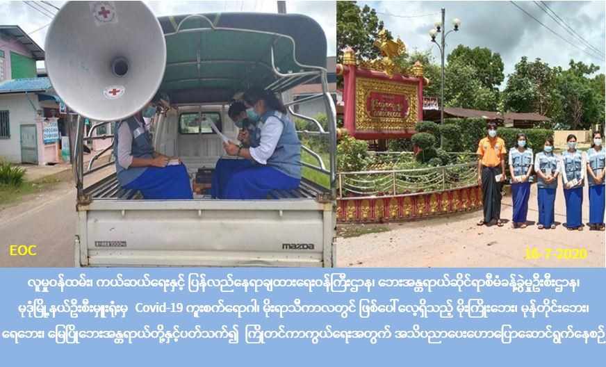 လူမှုဝန်ထမ်း၊ ကယ်ဆယ်ရေးနှင့် ပြန်လည်နေရာချထားရေးဝန်ကြီးဌာန၊ ဘေးအန္တရာယ်ဆိုင်ရာစီမံခန့်ခွဲမှုဦးစီးဌာန၊ မုဒုံမြို့နယ်ဦးစီးမှူးရုံးမှ တာဝန်ရှိသူများသည် (၁၆-၇-၂၀၂၀) ရက်နေ့ (၁၀:၀၀) နာရီအချိန်မှ (၁၃:၀၀) နာရီအချိန်အထိ မွန်ပြည်နယ်၊ မော်လမြိုင်ခရိုင်၊ မုဒုံမြို့နယ်၊ နိုင်လှုံ-လက်တက်ကျေးရွာ၊ အခွန်ကျေးရွာနှင့် ဂုံညှင်းတန်းကျေးရွာတို့တွင် COVID-19 ရောဂါကူးစက်ပျံနှံ့မှုမဖြစ်ပွားစေရေးနှင့် မိုးရာသီကာလအတွင်း ဖြစ်ပွားလေ့ရှိသည့် မိုးကြိုးဘေး၊ မုန်တိုင်းဘေး၊ ရေဘေး၊ မြေပြိုဘေးအန္တရာယ်များ ကြိုတင်ပြင်ဆင်ရေး အသိပညာပေးခြင်းနှင့် လက်ကမ်းစာစောင်များ ဖြန့်ဝေခြင်းတို့အားဆောင်ရွက်ခဲ့ပါကြောင်း သတင်းရရှိပါသည်။