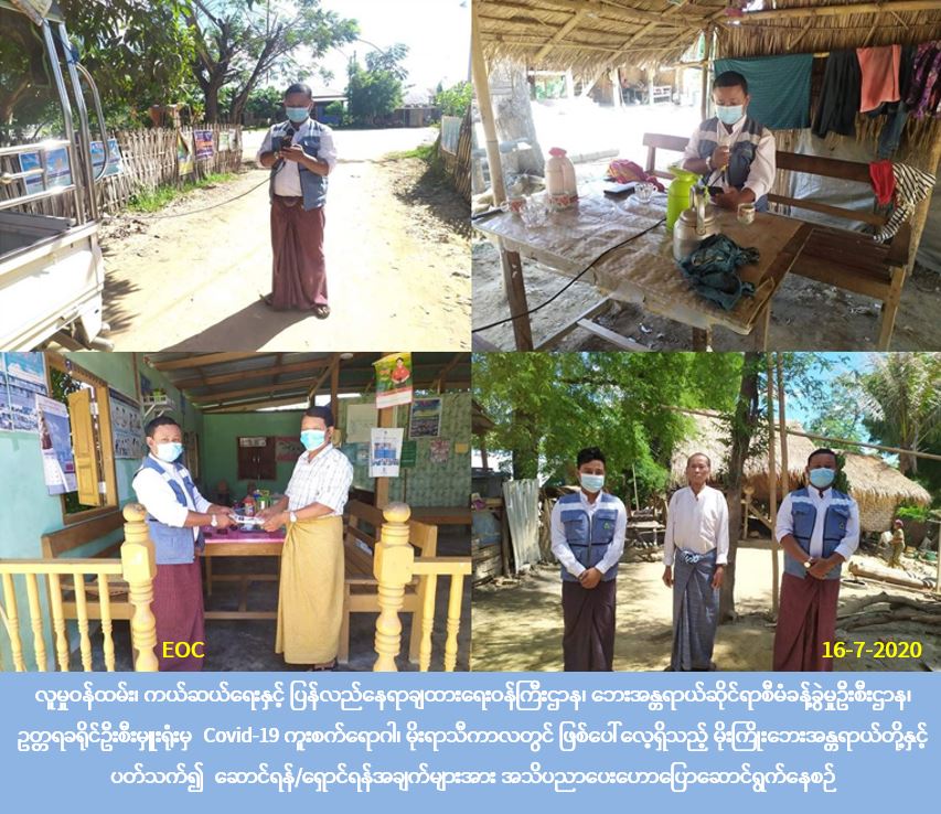 လူမှုဝန်ထမ်း၊ ကယ်ဆယ်ရေးနှင့် ပြန်လည်နေရာချထားရေးဝန်ကြီးဌာန၊ ဘေးအန္တရာယ်ဆိုင်ရာစီမံခန့်ခွဲမှုဦးစီးဌာန၊ ပြည်ထောင်စုနယ်မြေ၊ နေပြည်တော်၊ ဥတ္တရခရိုင်ဦးစီးမှူးရုံးမှ တာဝန်ရှိသူများသည် (၁၆-၇-၂၀၂၀) ရက်နေ့၊ (၁၀:၀၀) အချိန်မှ (၁၅:၃၀) အချိန်အထိ ဥတ္တရသီရိမြို့နယ်၊ နန်ချွန်ကျေးရွာ၊ ကွမ်းခြံစုကျေးရွာ၊ ဇလောင်း(တ၊မ)ကျေးရွာ၊ ငန်းစပ်ကျေးရွာ၊ ဘုရားကုန်းကျေးရွာနှင့် ဝက်စုကျေးရွာများအတွင်းရှိ ပြည်သူများအား COVID-19 ရောဂါကူးစက်ပြန့်နှံ့မှုများမဖြစ်ပွားစေရန်အတွက် သိရှိလိုက်နာဆောင်ရွက်ရမည့်အချက်များနှင့် မိုးရာသီကာလအတွင်း ဖြစ်ပွားတတ်သည့် ရေဘေးအန္တရာယ်နှင့် မိုးကြိုးဘေးအန္တရာယ်ဆိုင်ရာ ဆောင်ရန်/ ရှောင်ရန်အချက်များနှင့်ပတ်သက်၍ လက်ကမ်းစာစောင်များနှင့် ဗီနိုင်းပိုစတာများဖြန့်ဝေ ပေးအပ်၍ အသိပညာပေးခြင်းများဆောင်ရွက် ခဲ့ပါကြောင်း သတင်းရရှိပါသည်။
