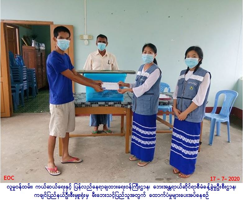 လူမှုဝန်ထမ်း၊ ကယ်ဆယ်ရေးနှင့် ပြန်လည်နေရာချထားရေး ဝန်ကြီးဌာန၊ ဘေးအန္တရာယ်ဆိုင်ရာစီမံခန့်ခွဲမှုဦးစီးဌာန၊ ကချင်ပြည်နယ် ဦးစီးမှူးရုံးမှ တာဝန်ရှိသူများသည် ကချင်ပြည်နယ်၊ မြစ်ကြီးနားမြို့၊ ကြက်ပေါင်ခြံရပ်ကွက်တွင် (၁၂-၇-၂၀၂၀)ရက်နေ့ (၁၄:၄၀) နာရီအချိန်ဖြစ်ပွားခဲ့သောမီးဘေးကြောင့် ဘေးသင့် အိမ်ထောင်စု (၁)စု၊ လူဦးရေ(၅)ဦးအတွက် ကယ်ဆယ်ရေး ပစ္စည်း(၁၇)မျိုး (၁)အိမ်ထောင်စုစာ၊ ဆန်ရိက္ခာ(၇)ရက်စာဖိုး (၁၀,၅၀ဝ/-)နှင့် အိမ်ဆောက်ပစ္စည်းဖိုး (၂၀၀,၀၀ဝ/-)အား (၁၇-၇-၂၀၂၀)ရက်နေ့ (၁၃:၀၀)နာရီအချိန်တွင် သွားရောက်ထောက်ပံ့ခဲ့ပါကြောင်း သတင်းရရှိပါသည်။