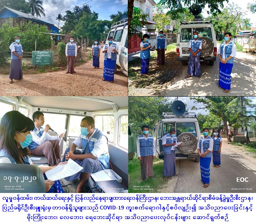 လူမှုဝန်ထမ်း၊ ကယ်ဆယ်ရေးနှင့် ပြန်လည်နေရာချထားရေးဝန်ကြီးဌာန၊ ဘေးအန္တရာယ်ဆိုင်ရာစီမံခန့်ခွဲမှုဦးစီးဌာန၊ ပြည်ခရိုင်ဦးစီးမှူးရုံးမှ တာဝန်ရှိသူများသည် (၁၇-၇-၂၀၂၀) ရက်နေ့တွင် ပြည်မြို့နယ်၊ မတောင့်တကျေးရွာ၊ ခေတ္တရာမြို့သစ်နှင့် နဝင်းကွက်သစ်တို့၌ Covid-19 အသက်ရှူလမ်းကြောင်းဆိုင်ရာ ကူးစက်ရောဂါနှင့်ပတ်သက်၍ အများပြည်သူများ သိရှိလိုက်နာနိုင်ရန် ကျန်းမာရေးနှင့် အားကစားဝန်ကြီးဌာနမှ ထုတ်ပြန်ထားသော အသိပေးကြေညာချက်များနှင့် မိုးကြိုးဘေး၊ လေဘေး၊ ရေဘေးနှင့်စပ်လျဉ်း၍ ဦးစီးဌာနမှထုတ်ပြန်ထားသည့် လက်ကမ်းစာစောင်များပါ ဆောင်ရန်/ရှောင်ရန်များအား အသိပညာပေးခြင်းများ ပြုလုပ်ခဲ့ကြောင်း သိရှိရပါသည်။