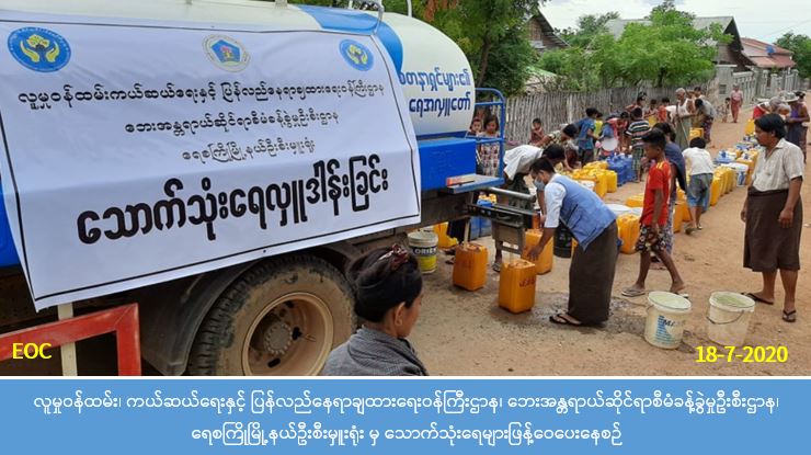 လူမှုဝန်ထမ်း၊ ကယ်ဆယ်ရေးနှင့် ပြန်လည်နေရာချထားရေးဝန်ကြီးဌာန၊ ဘေးအန္တရာယ်ဆိုင်ရာ စီမံခန့်ခွဲမှုဦးစီးဌာန၊ ရေစကြိုမြို့နယ်ဦးစီးမှူးရုံးမှ တာဝန်ရှိသူများသည် ရေစကြိုမြို့နယ်၊ ထန်း ငယ်တောကျေးရွာအုပ်စု၊ ထန်းငယ်တောကျေးရွာနှင့် ကျောက်လှေခါးကျေးရွာရှိ အိမ်ခြေ (၄၀၀) လုံး၊ အိမ်ထောင်စု (၅၁၀) စု၊ လူဦးရေ (၁၈၉၈) ဦးတို့အတွက် သောက်သုံးရေဂါလံ (၇,၂၀၀) အား (၁၈-၇-၂၀၂၀) ရက်နေ့၊ (၁၂:၃၀) နာရီအချိန်တွင် ရင်ခွင်မဲ့ကလေးငယ်များလျော့ချရေးနှင့် ကာကွယ်စောင့်ရှောက်ရေးအသင်းနှင့် ပူးပေါင်းကာသွားရောက် ဖြန့်ဝေခဲ့ပါကြောင်း သတင်း ရရှိ ပါသည်။