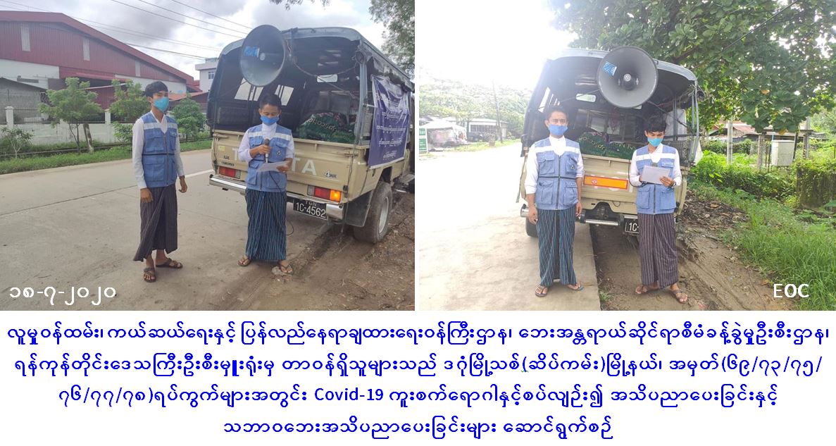 လူမှုဝန်ထမ်း၊ ကယ်ဆယ်ရေးနှင့် ပြန်လည်နေရာချထားရေးဝန်ကြီးဌာန၊ ဘေးအန္တရာယ်ဆိုင်ရာစီမံခန့်ခွဲမှုဦးစီးဌာန၊ ရန်ကုန်တိုင်းဒေသကြီးဦးစီးမှူးရုံးမှ တာဝန်ရှိသူများသည် (၁၈-၇-၂၀၂၀) ရက်နေ့တွင် ရန်ကုန်အရှေ့ပိုင်းခရိုင်၊ ဒဂုံမြို့သစ်(ဆိပ်ကမ်း)မြို့နယ်၊ အမှတ်(၆၉/၇၃/၇၅/၇၆/၇၇/၇၈)ရပ်ကွက်များအတွင်း Covid19 အသက်ရှူလမ်းကြောင်းဆိုင်ရာရောဂါနှင့်ပတ်သက်၍ အများပြည်သူများသိရှိလိုက်နာနိုင်ရန် ကျန်းမာရေးနှင့်အားကစားဝန်ကြီးဌာနမှ ထုတ်ပြန်ထားသော အသိပေးကြေငြာချက်များနှင့် မိုးကြိုးဘေး၊ ရေဘေးနှင့်စပ်လျဉ်း၍ ဦးစီးဌာနမှထုတ်ပြန်ထားသည့် လက်ကမ်းစာစောင်များပါ အချက်အလက်များအား သဘာဝဘေးအသိပညာပေးခြင်းများ ဆောင်ရွက်ခဲ့ကြောင်း သိရှိရပါသည်။