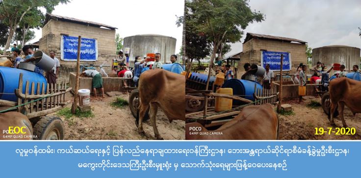 လူမှုဝန်ထမ်း၊ ကယ်ဆယ်ရေးနှင့် ပြန်လည်နေရာချထားရေးဝန်ကြီးဌာန၊ ဘေးအန္တရာယ်ဆိုင်ရာ စီမံခန့်ခွဲမှုဦးစီးဌာန၊ မကွေးတိုင်းဒေသကြီးဦးစီးမှူးရုံးမှ တာဝန်ရှိသူများသည် (၁၉- ၇-၂၀၂၀) ရက်နေ့၊ (၁၁:၀၀) နာရီအချိန်တွင် သောက်သုံးရေခက်ခဲလျက်ရှိသော မကွေးမြို့နယ်၊ ကြာကန် ကျေးရွာအုပ်စု၊ ကြူချောင်းရွာသစ်ကျေးရွာရှိ အိမ်ခြေ (၇၁) ၊ အိမ်ထောင်စု (၇၁) စု၊ လူဦးရေ (၃၅၈) ဦး တို့ကို သောက်သုံးရေဂါလံပေါင်း (၆,၀၀၀) အား သွားရောက်ဖြန့်ဝေပေးခဲ့ကြောင်း သတင်းရ ရှိပါသည်။