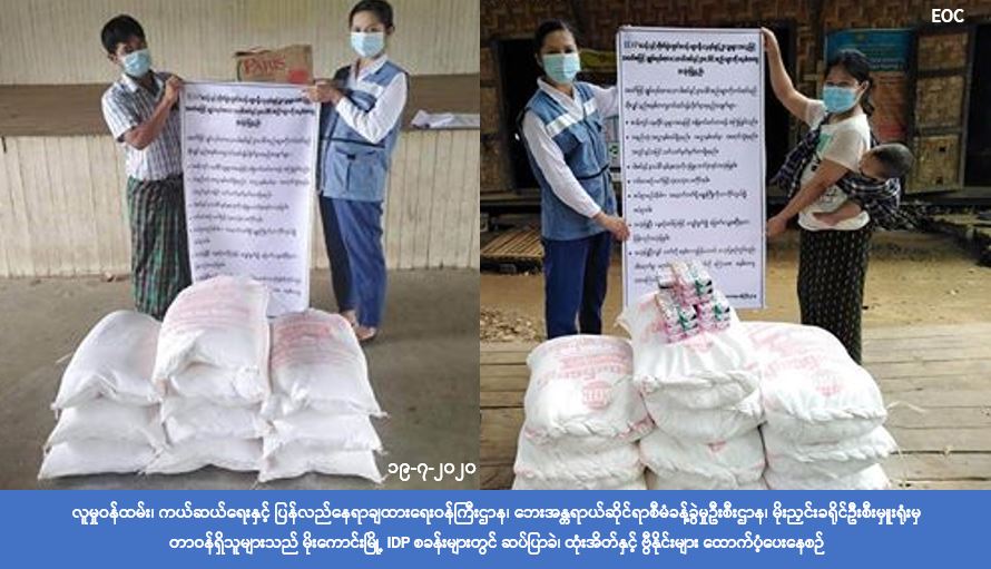 လူမှုဝန်ထမ်း၊ ကယ်ဆယ်ရေးနှင့်ပြန်လည်နေရာချထားရေးဝန်ကြီးဌာန၊ ဘေးအန္တရာယ်ဆိုင်ရာစီမံခန့်ခွဲမှုဦးစီးဌာန၊ မိုးညှင်းခရိုင်ဦးစီးမှူးရုံးမှတာဝန်ရှိသူများသည် (၁၉-၇-၂၀၂၀) ရက်နေ့တွင် မိုးကောင်းမြို့၊ ကျွန်းတောရပ်ကွက် IDP နှစ်ခြင်းဘုရားကျောင်း၊ နောင်ကိုင်တော် မဟောင်IDPစခန်းနှင့် နတ်ကြီးကုန်းIDPစခန်း(၃)ခု မှ အိမ်ထောင်စု(၃၈)စု၊ လူဦးရေ(၁၉၁)ဦးအတွက် ဆပ်ပြာ(၁၉၁)ခဲ၊ ထုံး(၃၀)အိတ်နှင့်ဗွီနိုင်း(၃)ခု တို့ကို သွားရောက်ထောက်ပံ့ပေးအပ် ခဲ့ကြောင်း သိရှိရပါသည်။