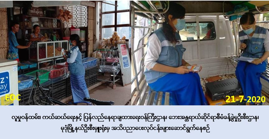 လူမှုဝန်ထမ်း၊ ကယ်ဆယ်ရေးနှင့် ပြန်လည်နေရာချထားရေးဝန်ကြီးဌာန၊ ဘေးအန္တရာယ်ဆိုင်ရာ စီမံခန့်ခွဲမှုဦးစီးဌာန၊ မုဒုံမြို့နယ်ဦးစီးမှူးရုံးမှ တာဝန်ရှိသူများသည် (၂၁-၇-၂၀၂၀) ရက်နေ့၊ (၁၀:၀၀) နာရီအချိန်မှ (၁၃:၀၀) နာရီအချိန်အထိ မွန်ပြည်နယ်၊ မော်လမြိုင်ခရိုင်၊ မုဒုံမြို့နယ်၊ မြို့မ(၁)ရပ်ကွက်နှင့် မြို့မ(၂)ရပ်ကွက်တို့တွင် COVID-19 ရောဂါ ကူးစက်ပြန့်နှံ့မှု မဖြစ်ပွားစေရေး နှင့် မိုးရာသီကာလအတွင်း ဖြစ်ပွားလေ့ရှိသည့် မိုးကြိုးဘေး၊ မုန်တိုင်းဘေး၊ ရေဘေး၊ မြေပြိုဘေး အန္တရာယ်များ ကြိုတင်ပြင်ဆင်ရေး အသိပညာပေးခြင်းနှင့် လက်ကမ်းစာစောင်များ ဖြန့်ဝေခြင်း တို့အား ဆောင်ရွက်ခဲ့ပါကြောင်း သတင်းရရှိပါသည်။