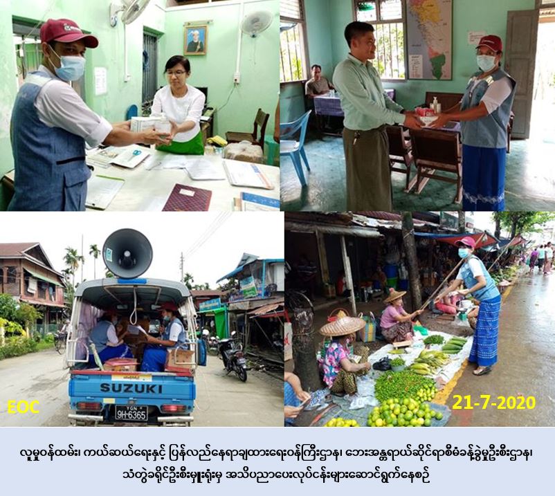 လူမှုဝန်ထမ်း၊ ကယ်ဆယ်ရေးနှင့် ပြန်လည်နေရာချထားရေးဝန်ကြီးဌာန၊ ဘေးအန္တရာယ်ဆိုင်ရာ စီမံခန့်ခွဲမှုဦးစီးဌာန၊ သံတွဲခရိုင်ဦးစီးမှုးရုံးမှ တာဝန်ရှိသူများသည် (၂၁-၇-၂၀၂၀)ရက်နေ့၊ နံနက် (၀၈:၀၀)နာရီအချိန်မှ ညနေ(၁၆:၀၀)နာရီအချိန်ထိ Irrawaddy Green Towers Ltd နှင့် ပူးပေါင်း၍ ကိုရိုနာဗိုင်းရပ်စ်ရောဂါ (Covid-19) ကြိုတင်ကာကွယ်ရေးအထောက်အကူပြု ပစ္စည်းများပေးအပ်ခြင်း၊ Covid-19 နှင့် သဘာဝဘေးအန္တရာယ်ဆိုင်ရာ အသိပညာပေးလုပ်ငန်း များ ဆောင်ရွက်ခြင်းနှင့် လက်ကမ်းစာစောင်များပေးဝေခြင်းတို့ကို သံတွဲခရိုင် ၊ သံတွဲမြို့၊ ဒွါရာ ဝတီမြို့မဈေးနှင့် ရပ်ကွက် (၁၊၂၊၃၊၄) တို့၌ဆောင်ရွက်ခဲ့ပြီး၊ ခရိုင်မြို့နယ်အဆင့် ဌာနဆိုင်ရာ ရုံးများ၊ အ.ထ.က၊ ထ(ခွဲ)စာသင်ကျောင်းများနှင့် ဈေးအတွင်း ပြည်သူတို့အား covid-19 အထောက်အကူပြုပစ္စည်းများ ပေးဝေခြင်းတို့ကို ဆောင်ရွက်ခဲ့ကြောင်း သတင်းရရှိပါသည်။
