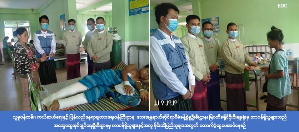 ကရင်ပြည်နယ်၊ မြဝတီမြို့၊ ထီးဝါးကလေးကျေးရွာအုပ်စု၊ သီဝါးပုကျေးရွာ၊ မဲ့ပလဲချောင်းစပ်တွင် (၂၁-၇-၂၀၂၀)ရက်နေ့ (၁၆:၃၀)နာရီအချိန် မောင်စောချာထူးလေး(၁၂)နှစ်၊ မောင်စောဖိုးကို(၁၁)နှစ်၊ မောင်စောမောင်ခန့်(၁၁)နှစ်၊ မောင်စောကျော်ခလယ်(၁၁)နှစ်တို့သည် (၄)ဦးသည် နွားကျောင်းနေစဉ် မိုင်းကြွင်းမိုင်းကျန်မှ ပေါက်ကွဲမှုကြောင့် မောင်စောချာထူးလေး၊ ယာဘက်လက်ကောက်ဝတ်ပြတ်၍ (စိုးရိမ်ရ)(၁)ဦးနှင့် ကျန်(၃)ဦးမှာ ဒဏ်ရာရ(မစိုးရိမ်ရ)အခြေအနေဖြင့် မြဝတီခရိုင်ပြည်သူ့ဆေးရုံတွင် ဆေးကုသမှုခံယူလျက်ရှိသောကြောင့် ဆေးရုံတက်လူနာ(၄)ဦးအတွက် (၁)ဦးလျင် ထောက်ပံ့ငွေ (၅၀,၀၀၀) ကျပ်နှုန်းဖြင့် စုစုပေါင်းထောက်ပံ့ငွေ(၂၀၀,၀၀၀) ကျပ်တို့ကို ခရိုင်အုပ်ချုပ်ရေးမှူး၊ ဒုတိယခရိုင်အုပ်ချုပ်ရေးမှူး၊ ဒုတိယမြို့နယ် အုပ်ချုပ်ရေးမှူး၊ အထွေထွေအုပ်ချုပ်ရေးဦးစီးဌာနတို့နှင့် အတူ လူမှုဝန်ထမ်း၊ ကယ်ဆယ်ရေးနှင့် ပြန်လည်နေရာချထားရေးဝန်ကြီးဌာန၊ ဘေးအန္တရာယ်ဆိုင်ရာ စီမံခန့်ခွဲမှုဦးစီးဌာန၊ မြဝတီခရိုင်ဦးစီးမှူးရုံးမှ တာဝန်ရှိသူများသည် (၂၂-၇-၂၀၂၀)ရက်နေ့ (၁၃:၃၀) နာရီအချိန်တွင် ဆေးရုံသို့သွားရောက်၍ ထောက်ပံ့ပေးခဲ့ကြောင်း သိရှိရပါသည်။