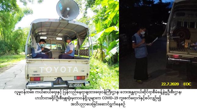 လူမှုဝန်ထမ်း၊ ကယ်ဆယ်ရေးနှင့် ပြန်လည်နေရာချထားရေးဝန်ကြီးဌာန၊ ဘေးအန္တရာယ်ဆိုင်ရာစီမံခန့်ခွဲမှုဦးစီး ဌာန၊ ဟင်္သာတခရိုင်ဦးစီးမှူးရုံးမှတာဝန်ရှိသူများသည် (၂၂-၇-၂၀၂၀)ရက်နေ့၊ (၀၈:၀၀) နာရီအချိန်မှ (၁၁:၀၀) နာရီအချိန်အထိ ဟင်္သာတခရိုင်၊ ဇလွန်မြို့နယ်၊ အရုပ်ကွင်းအုပ်စု၊ (အရုပ်ကွင်း၊ မောင်းထောင်) ကျေးရွာတို့၌လည်းကောင်း၊ (၁၈:၀၀) နာရီအချိန်မှ (၂၀:၀၀) နာရီအချိန်အထိ ဟင်္သာတမြို့နယ်၊ ရွှေကူရပ်ကွက်နှင့် ဆကာရပ်ကွက်တို့၌လည်းကောင်း COVID-19 ရောဂါနှင့်စပ်လျဉ်း၍ ဒုတိယလှိုင်း ကူးစက်မှုမဖြစ်ပွားစေရန် ဆောင်ရန်/ရှောင်ရန်အချက်များ၊ ရာသီအလိုက်ဖြစ်ပွားလေ့ရှိသည့် မိုးကြိုးဘေး၊ ရေဘေး၊ လေပြင်းဘေးတို့နှင့်စပ်လျဉ်း၍ ဆောင်ရန်/ရှောင်ရန်အချက်များကို အသိပညာပေးနှိုးဆော်ခဲ့ပြီး လက်ကမ်းစာစောင်များ ဖြန့်ဝေပေးခဲ့ပါကြောင်း သတင်းရရှိပါသည်။