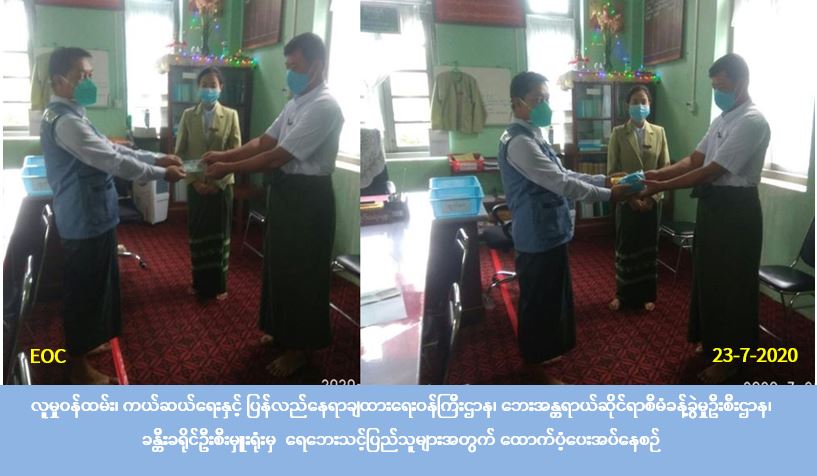 လူမှုဝန်ထမ်း၊ ကယ်ဆယ်ရေးနှင့် ပြန်လည်နေရာချထားရေးဝန်ကြီးဌာန၊ ဘေးအန္တရာယ်ဆိုင်ရာစီမံခန့်ခွဲမှုဦးစီးဌာန၊ ခန္တီးခရိုင်ဦးစီးမှူးရုံးမှ တာဝန်ရှိသူများသည် ခန္တီးမြို့နယ်၊ အောင်မြေကျေးရွာအုပ်စု၊ လာဝယ်ကျေးရွာ၌ (၂၁-၇-၂၀၂၀) ရက်နေ့တွင် နန်တုံထွန်းချောင်းရေဝင်ရောက်မှုကြောင့် ရေဘေးသင့်ခဲ့သည့်အိမ်ထောင်စု (၃) စု၊ လူဦးရေ (၁၉) ဦးတို့အတွက် ဆန်ရိက္ခာဖိုးထောက်ပံ့ငွေ (၃၉,၉၀၀) ကျပ်၊ ဆပ်ပြာ(၃)တောင့်နှင့် နှာခေါင်းစည်း(၁၉)ခုတို့အား (၂၃-၇-၂၀၂၀) ရက်နေ့၊ (၁၁:၀၇) နာရီအချိန်တွင် မြို့နယ်အုပ်ချုပ်ရေးမှူးရုံးခန်း၌ သက်ဆိုင်ရာကျေးရွာစာရေးထံသို့ လွှဲပြောင်းထောက်ပံ့ပေးအပ် ခဲ့ပါကြောင်း သတင်းရရှိပါသည်။