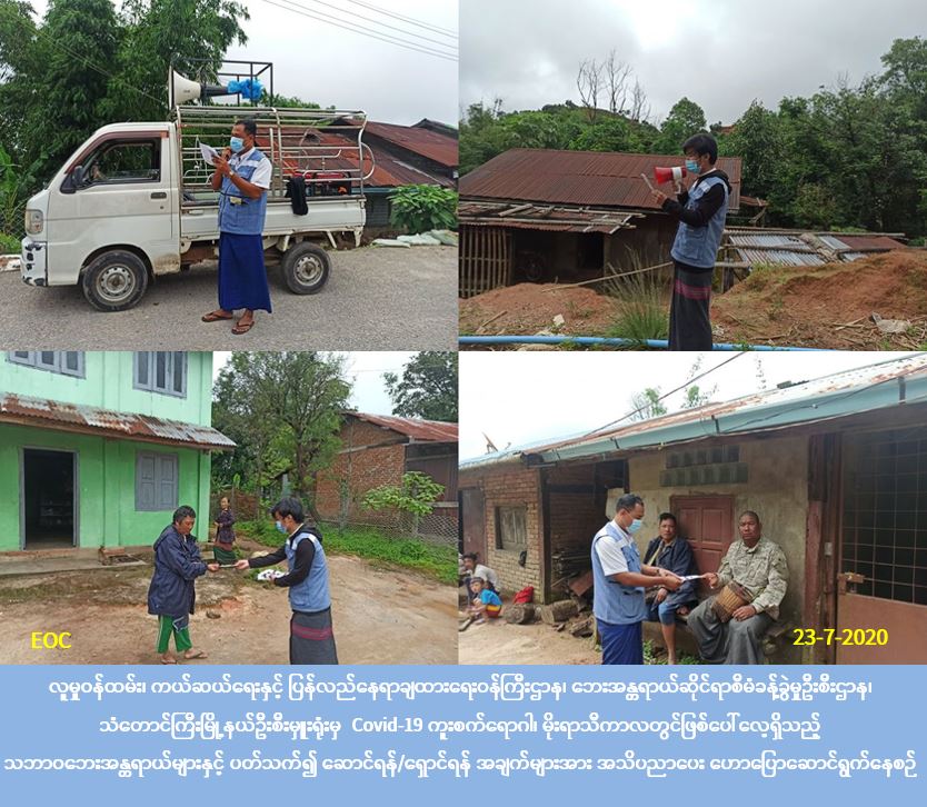 လူမှုဝန်ထမ်း၊ ကယ်ဆယ်ရေးနှင့် ပြန်လည်နေရာချထားရေးဝန်ကြီးဌာန၊ ဘေးအန္တရာယ်ဆိုင်ရာစီမံခန့်ခွဲမှုဦးစီးဌာန၊ သံတောင်ကြီးမြို့နယ်ဦးစီးမှူးရုံးမှ တာဝန်ရှိသူများသည် (၂၃-၇-၂၀၂၀) ရက်နေ့ နံနက်(၉:၀၀)နာရီမှ နေ့လည်(၁၂:၀၀)ထိ သံတောင်ကြီးမြို့နယ် ခုံတိုင်ကျေးရွာအုပ်စုတွင်ရှိသော ခုံတိုင်ကျေးရွာ၊ လမဲကြီးကျေးရွာ၊ လမဲကလေးကျေးရွာနှင့် စဘားလော်ချီးကျေးရွာများတွင် Covid-19 ကူးစက်မြန်ရောဂါ ပြန့်ပွားမှုများမဖြစ်ပွားစေရန်အတွက် သိရှိလိုက်နာရမည့်အချက်များနှင့် မိုးရာသီကာလအတွင်း ဖြစ်ပွားတတ်သော သဘာဝဘေးအန္တရယ်များနှင့်စပ်လျဉ်း၍ ဆောင်ရန်/ရှောင်ရန်အချက်များကို လော်စပီကာဖြင့် ပြည်သူလူထုအတွင်း အသိပညာပေးဆောင်ရွက်ခဲ့ပြီး လက်ကမ်းစာစောင်များလည်းဖြန့်ဝေခဲ့ပါကြောင်း သတင်းရရှိပါသည်။