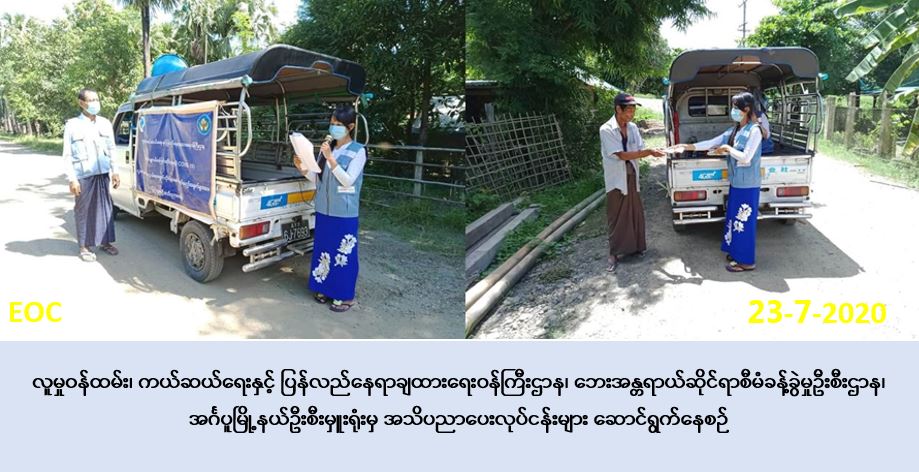 လူမှုဝန်ထမ်း၊ ကယ်ဆယ်ရေးနှင့် ပြန်လည်နေရာချထားရေးဝန်ကြီးဌာန၊ ဘေးအန္တရာယ်ဆိုင်ရာ စီမံခန့်ခွဲမှုဦးစီးဌာန၊ အင်္ဂပူမြို့နယ်ဦးစီးမှူးရုံးမှ တာဝန်ရှိသူများသည် (၂၃-၇-၂၀၂၀)ရက်နေ့၊ (ဝ၉:၀၀)နာရီအချိန်မှစ၍ ကွင်းကောက်တောင်ကျေးရွာအုပ်စု၊ ကွင်းကောက်တောင်ကျေးရွာ၊ ပေါက်သာကုန်းကျေးရွာ၊ ပေါက်ပင်ချောင်ကျေးရွာ၊ ညောင်ကုန်ကျေးရွာ၊ ဘို့ကုန်းကျေးရွာ၊ ရွာကလေးကျေးရွာများ၊ ကွင်းကောက်မြောက်ကျေးရွာအုပ်စု၊ ချောင်းခွကျေးရွာ၊ တလုပ်ကုန်း ကျေးရွာ၊ ကွမ်းခြံကုန်းကျေးရွာ၊ အောင်ချမ်းသာကျေးရွာ၊ သာပေါင်းကျေးရွာတို့တွင် ( ဒုတိယ အကြိမ်) အဖြစ် ကျန်းမာရေးနှင့်အားကစားဝန်ကြီးဌာနမှ ထုတ်ပြန်ထားသော Covid-19 ကူးစက်မှု ဒုတိယလှိုင်းမဖြစ်စေရန် အသိပညာပေးခြင်းလုပ်ငန်းများနှင့် ဧရာဝတီတိုင်းဒေသကြီး Covid -19 ထိန်းချုပ်ရေးနှင့် အရေးပေါ်တုံ့ပြန်ရေးကော်မတီမှ (၁၄-၇-၂၀၂၀) ရက်နေ့အထိ ထုတ် ပြန်ပြီးဖြစ်သည့် တားမြစ်မိန့်နှင့် ညွန်ကြားချက်အားလည်းကောင်း၊ ရာသီအလိုက်ဖြစ်ပွား တတ်သော သဘာဝဘေးများအန္တရာယ်များနှင့် ပတ်သက်သည့် သဘာဝဘေးအသိပညာပေးခြင်း တို့အားလည်းကောင်း၊ အများပြည်သူများသိရှိလိုက်နာရန် ကွင်းဆင်းလှည့်လှည်၍ အသိပညာ ပေးလုပ်ငန်းများ ပြုလုပ်ဆောင်ရွက်ခဲ့ကြောင်း သတင်းရရှိပါသည်။