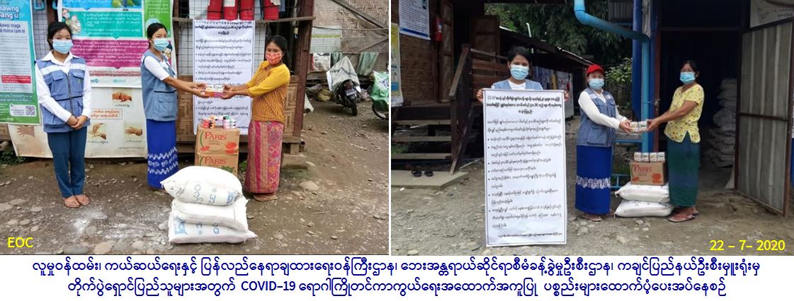 လူမှုဝန်ထမ်း၊ ကယ်ဆယ်ရေးနှင့်ပြန်လည်နေရာချထားရေးဝန်ကြီးဌာန၊ ဘေးအန္တရာယ်ဆိုင်ရာစီမံခန့်ခွမှုဦးစီးဌာန၊ ကချင်ပြည်နယ်ဦးစီး မှူးရုံးမှ တာဝန်ရှိသူများသည် (၂၂-၇-၂၀၂၀) ရက်နေ့တွင် ဆပ်ပြာ (၉၄၂) ခဲ၊ ထုံး (၄၀)အိတ်၊ နှာခေါင်းစည်း၊ ဗီနိုင်း ပိုစတာအား ဝိုင်းမော်မြို့နယ်ရှိ၊ မြို့မနှစ်ခြင်း၊ လော်ဝေါ်နှစ်ခြင်း၊ မှုရင်းနှစ်ခြင်း၊ လော်ဝေါ်အေဂျီစခန်းတို့ရှိ တိုက်ပွဲရှောင်ပြည်သူများ အတွက် သွားရောက်ပေးအပ်ထောက်ပံ့ခဲ့ပါကြောင်း သတင်းရရှိပါသည်။