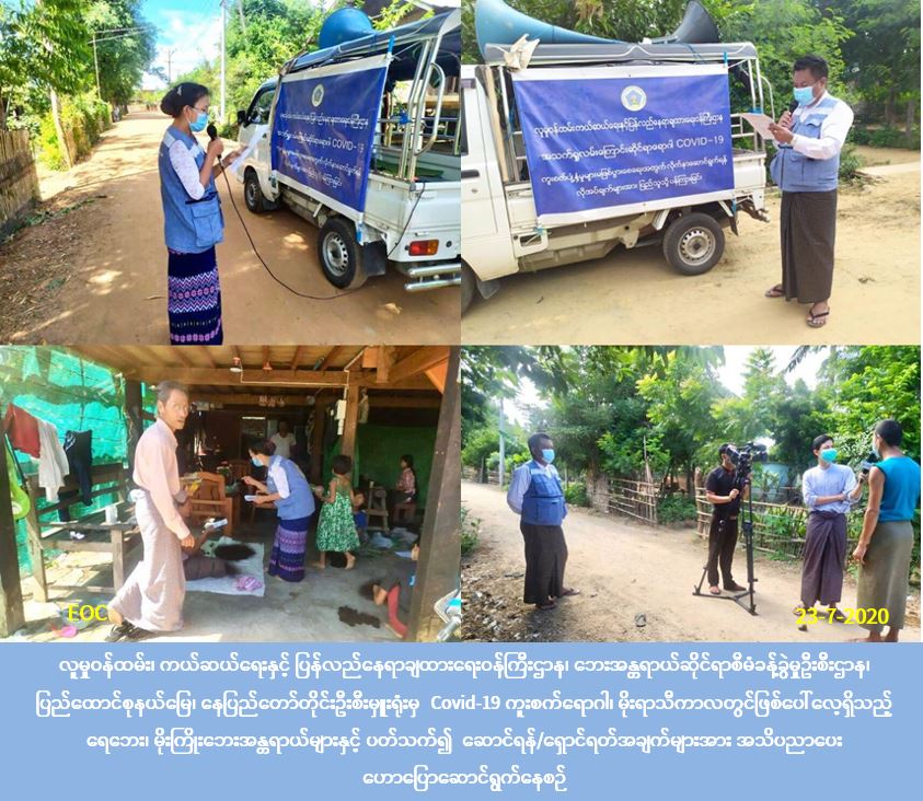လူမှုဝန်ထမ်း၊ ကယ်ဆယ်ရေးနှင့် ပြန်လည်နေရာချထားရေးဝန်ကြီးဌာန၊ ဘေးအန္တရာယ်ဆိုင်ရာစီမံခန့်ခွဲမှုဦးစီးဌာန၊ ပြည်ထောင်စုနယ်မြေ၊ နေပြည်တော်တိုင်းဦးစီးမှူးရုံးမှ တာဝန်ရှိသူများသည် (၂၃-၇-၂၀၂၀) ရက်နေ့၊ (၀၉:၀၀) အချိန်မှ (၁၅:၃၀) အချိန်အထိ ပြည်သူများအား COVID-19 ရောဂါကူးစက်ပြန့်နှံ့မှုများမဖြစ်ပွားစေရန်အတွက် သိရှိလိုက်နာဆောင်ရွက်ရမည့် အချက်များနှင့်ပတ်သက်၍လည်းကောင်း၊ မိုးရာသီကာလအတွင်း ဖြစ်ပွားတတ်သည့် ရေဘေးအန္တရာယ်နှင့် မိုးကြိုးဘေးအန္တရာယ်ဆိုင်ရာ ဆောင်ရန်/ ရှောင်ရန်အချက်များနှင့်ပတ်သက်၍လည်းကောင်း အသိပညာပေးခြင်းကို လယ်ဝေးမြို့နယ်၊ ကြောင်ရေကျေးရွာအုပ်စု၊ ကြောင်ရေကျေးရွာ၊ သာယာစုကျေးရွာ၊ သပြေတန်းကျေးရွာနှင့် ပြောင်ခေါင်းကြီးကျေးရွာအုပ်စု၊ ကန်ဇွန်းခင်းကျေးရွာနှင့် ကြို့ဇလုပ် ကျေးရွာများအတွင်းရှိ ပြည်သူများသို့ လက်ကမ်းစာစောင်များဖြန့်ဝေပေးအပ်ခဲ့ပါကြောင်း သတင်းရရှိပါသည်။