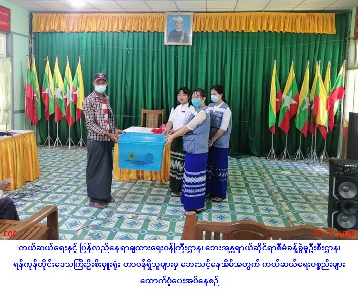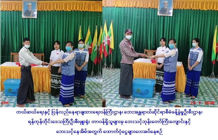 လူမှုဝန်ထမ်း၊ ကယ်ဆယ်ရေးနှင့် ပြန်လည်နေရာချထားရေးဝန်ကြီးဌာန၊ ဘေးအန္တရာယ်ဆိုင်ရာစီမံ ခန့်ခွဲမှုဦးစီးဌာန၊ ရန်ကုန်တိုင်းဒေသကြီးဦးစီးမှူးရုံးမှ တာဝန်ရှိသူများသည် ရန်ကုန်တိုင်းဒေသကြီး၊ မြောက်ပိုင်းခရိုင်၊ တိုက်ကြီးမြို့နယ်၊ ဆင်စခန်းကျေးရွာအုပ်စု၊ ကန်သာယာကျေးရွာနှင့် ရွှေမင်းဝင်အတွင်း (၂၇-၆-၂၀၂၀) ရက်နေ့၌ တောဆင်ရိုင်းဝင်ရောက်ဖျက်ဆီးမှုကြောင့် ဘေးသင့်နေအိမ် (၁) လုံးနှင့် ဘုန်းတော်ကြီးကျောင်း ဆွမ်းစားဆောင်ပျက်စီးမှုအတွက် အိမ်/ကျောင်းဆောက်ပစ္စည်းဖိုးထောက်ပံ့ငွေ (၆၀,၀၀၀/-) ကျပ်၊ ကယ်ဆယ်ရေးပစ္စည်း (၁၁) မျိုး (၁) အိမ်ထောင်စာနှင့် လူဦးရေ(၆)ဦးတို့အတွက် ဆန်ရိက္ခာဖိုးထောက်ပံ့ငွေ (၁၂,၆၀၀/-) ကျပ်တို့အား (၂၃-၇-၂၀၂၀) ရက်နေ့၊(၁၁:၀၀) နာရီအချိန်တွင် သွားရောက်ထောက်ပံ့ပေးအပ်ခဲ့ကြောင်း သတင်းရရှိပါသည်။