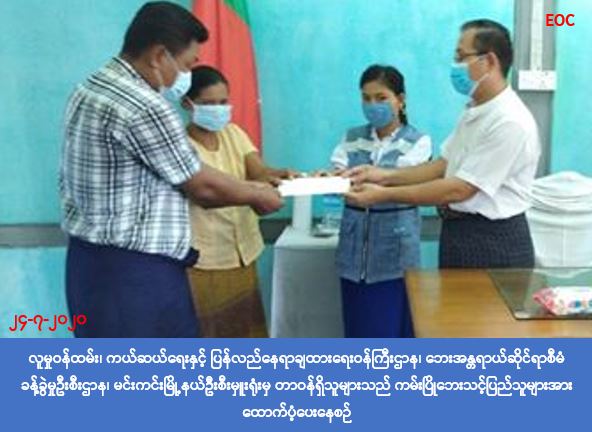 လူမှုဝန်ထမ်း၊ ကယ်ဆယ်ရေးနှင့် ပြန်လည်နေရာချထားရေးဝန်ကြီးဌာန၊ ဘေးအန္တရာယ်ဆိုင်ရာစီမံခန့်ခွဲမှုဦးစီး ဌာန၊ မင်းကင်းမြို့နယ်ဦးစီးမှူးရုံးမှ တာဝန်ရှိသူများသည် မင်းကင်းမြို့နယ်၊ သံပေါက်ကျေးရွာအုပ်စု၊ သံပေါက် ကျေးရွာတွင် (၂၁-၇-၂၀၂၀)ရက်နေ့၌ မြစ်ကမ်းပါးပြိုကျမှုကြောင့် ရွှေ့ပြောင်းအိမ်ထောင်စု(၁)စု ၊လူဦးရေ(၄)ဦးတို့ အတွက် ထောက်ပံ့ငွေ (၁၀၈,၄၀၀)ကျပ်ကို (၂၄-၇-၂၀၂၀)ရက်နေ့တွင် မင်းကင်းမြို့နယ်အထွေထွေအုပ်ချုပ်ရေး ဦးစီးဌာန၌ ထောက်ပံ့ပေးခဲ့ကြောင်း သိရှိရပါသည်။