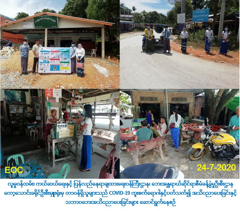 လူမှုဝန်ထမ်း၊ ကယ်ဆယ်ရေးနှင့် ပြန်လည်နေရာချထားရေးဝန်ကြီးဌာန၊ ဘေးအန္တရာယ် ဆိုင်ရာစီမံခန့်ခွဲမှုဦးစီးဌာန၊ ကော့သောင်းခရိုင်ဦးစီးမှူးရုံးမှ တာဝန်ရှိသူများသည် (၂၄-၇-၂၀၂၀) ရက်နေ့တွင် ကော့သောင်းခရိုင်၊ ကော့သောင်းမြို့၊ (၁၀) မိုင်ကျေးရွာအတွင်းရှိ ပြည်သူများအား မိုးရာသီကာလအတွင်း ဖြစ်ပေါ်နိုင်သော သဘာဝဘေးအန္တရာယ်များနှင့် ပက်သက်၍ ဆောင်ရန်/ရှောင်ရန်များ၊ covid-19ရောဂါနှင့် ပတ်သက်၍ အသိပညာပေးခြင်း၊ လော်စပီကာဖြင့် လိုက်လံနှိုူးဆော်ခြင်းများ ဆောင်ရွက်ခဲ့ကြောင်း သတင်းရရှိပါသည်။