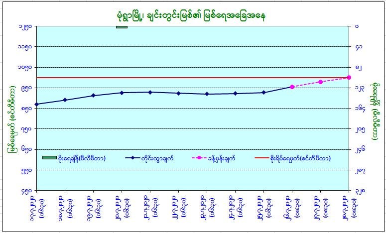 ယနေ့မြန်မာစံတော်ချိန် (၀၈:၃၀)နာရီအချိန် တိုင်းထွာချက်အရ ချင်းတွင်းမြစ်ရေသည် မုံရွာမြို့တွင် ယင်းမြို့၏ စိုးရိမ်ရေမှတ်အောက် (၁)ပေခွဲခန့်တွင် ရောက်ရှိနေပါသည်။ အဆိုပါ မြစ်ရေသည် နောက်(၂)ရက်အတွင်း ယင်းမြို့၏ စိုးရိမ်ရေမှတ်သို့ ရောက်ရှိနိုင်ပါသည်။