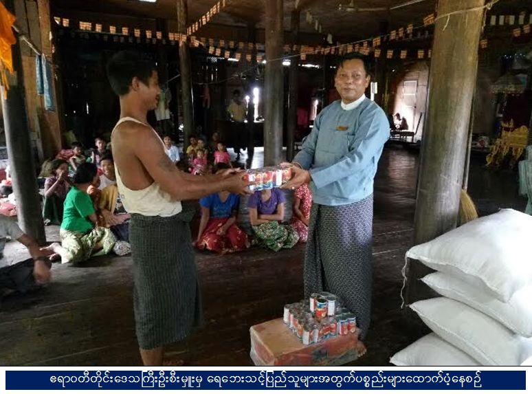 ဧရာဝတီတိုင်းဒေသကြီး၊ ငါးသိုင်းချောင်းမြို့အတွင်းရှိ ကျေးရွာများတွင် (၅-၈-၂၀၁၆) ရက်နေ့အထိ ကယ်ဆယ်ရေးစခန်း (၄)ခုသို့ရောက်ရှိနေထိုင်လျက်ရှိသည့် အိမ်ထောင်စု (၃၆)စုမှ လူဦးရေ (၁၅၄) ဦးအတွက် ဆန် (၃) ရက်စာတန်ဖိုးငွေကျပ် (၁၂၇,၀၅၀)၊ ငါးသေတ္တာတန်ဖိုးငွေကျပ် (၃၆,၇၀၀) စုစုပေါင်းတန်ဖိုးငွေကျပ် (၁၆၃၇၅၀)အား (၆-၈-၂၀၁၆) ရက်နေ့တွင် ကယ်ဆယ်ရေးနှင့် ပြန်လည်နေရာချထားရေးဦးစီးဌာန၊ ဧရာဝတီတိုင်းဦးစီးမှူးမှ ကွင်းဆင်းထောက်ပံ့ခဲ့ကြောင်း သတင်း ရရှိပါသည်။