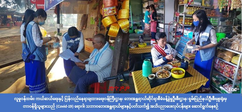 (၂၅-၇-၂၀၂၀) ရက်နေ့တွင် လူမှုဝန်ထမ်း၊ ကယ်ဆယ်ရေးနှင့် ပြန်လည်နေရာချထားရေးဝန်ကြီးဌာန၊ ဘေးအန္တရာယ်ဆိုင်ရာစီမံခန့်ခွဲမှုဦးစီးဌာန၊ ရှမ်းပြည်နယ်ဦးစီးမှူးရုံးမှ တာဝန်ရှိသူများသည် ရှမ်းပြည်နယ်အစိုးရ အဖွဲ့၏ ကြီးကြပ်မှုဖြင့် ပင်လောင်းမြို့နယ်၊ နန်းတိုင်းစျေးနှင့် တီဂျစ်စျေးတို့၌ (Covid-19) ရောဂါကူးစက်မှု ဒုတိယလှိုင်းမဖြစ်ပွားစေရန် (Covid-19) ကူးစက်ရောဂါကြိုတင်ကာကွယ်ရေးအသိပညာပေးခြင်းနှင့် သဘာဝဘေး ဆိုင်ရာ အသိပညာပေးခြင်းများ Hand Speaker များဖြင့် လိုက်လံဟောပြောခြင်း၊ Mask နှင့် အသိပညာပေး လက်ကမ်းစာစောင်များပေးဝေခြင်းတို့အား ဆောင်ရွက်ခဲ့ကြောင်း သိရှိရပါသည်။