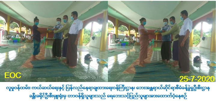လူမှုဝန်ထမ်း၊ ကယ်ဆယ်ရေးနှင့် ပြန်လည်နေရာချထားရေးဝန်ကြီးဌာန၊ ဘေးအန္တရာယ် ဆိုင်ရာစီမံခန့်ခွဲမှုဦးစီးဌာန၊ ခန္တီးခရိုင်ဦးစီးမှူးရုံးမှ တာဝန်ရှိသူများသည် ခန္တီးမြို့နယ်၌ ၂၀၂၀ ခုနှစ်၊ ဇူလိုင်လတွင် မိုးသည်းထန်စွာရွာသွန်းမှုကြောင့် ချင်းတွင်းမြစ်ကမ်းဘေးဝဲယာနှင့် မြေနိမ့်ပိုင်းနေရာများသို့ ရေဝင်ရောက်ခဲ့ရာ (၂၄-၇-၂၀၂၀) ရက်နေ့တွင် ထပ်မံပြောင်းရွှေ့ ရသည့် ခန္တီးမြို့နယ်၊ ပေါမိုင်းရပ်ကွက်နှင့်မြို့မရပ်ကွက်မှ စုစုပေါင်းအိမ်ထောင်စု (၇) စု၊ လူဦးရေ (၃၂) ဦးတို့အတွက် ဆန်ရိက္ခာဖိုးထောက်ပံ့ငွေ (၆၇၂,၀ဝိ/-) ကျပ်၊ ဆပ်ပြာ(၇) တောင့်နှင့် နှာခေါင်းစည်း(၃၂)ခုတို့ကို (၂၅-၇-၂၀၂၀) ရက်နေ့၊ (၁၁:၄၈) နာရီအချိန်တွင် ထောက်ပံ့ပေးခဲ့ကြောင်း သတင်းရရှိပါသည်။