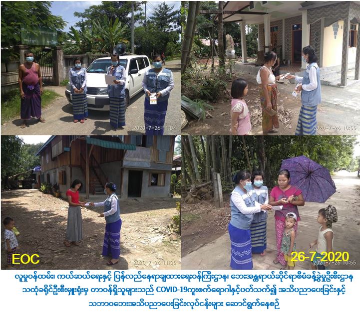 လူမှုဝန်ထမ်း၊ ကယ်ဆယ်ရေးနှင့် ပြန်လည်နေရာချထားရေးဝန်ကြီးဌာန၊ ဘေးအန္တရာယ် ဆိုင်ရာစီမံခန့်ခွဲမှုဦးစီးဌာန၊ သထုံခရိုင်ဦးစီးမှူးရုံးမှ တာဝန်ရှိသူများသည် (၂၆-၇-၂၀၂၀) ရက်နေ့၊ (၁၀:၀၀)နာရီအချိန်မှ (၁၃:၀၀) နာရီအချိန်ထိ မွန်ပြည်နယ်၊ သထုံခရိုင်၊ သထုံ မြို့နယ်၊ မြေနီကုန်းကျေးရွာ ဇရစ်ချောင်ကျေးရွာနှင့် တောစွန်းကျေးရွာတို့တွင် Covid-19 ရောဂါကူးစက်ပျံ့နှံ့မှုများမဖြစ်ပွားစေရေးနှင့် မိုးရာသီကာလအတွင်းဖြစ်ပွားလေ့ရှိသည့် မိုးကြိုးဘေး၊ မုန်တိုင်းဘေး၊ ရေဘေး၊ မြေပြိုဘေးအန္တရာယ်များ ကြိုတင်ပြင်ဆင်ရေး အသိ ပညာပေးခြင်းနှင့် လက်ကမ်းစာစောင်ဖြန့်ဝေခြင်းတို့ကို ဆောင်ရွက်ခဲ့ကြောင်း သတင်းရရှိပါသည်။