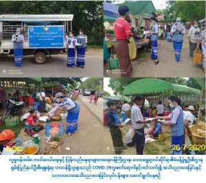 လူမှုဝန်ထမ်း၊ ကယ်ဆယ်ရေးနှင့် ပြန်လည်နေရာချထားရေးဝန်ကြီးဌာန၊ ဘေးအန္တရာယ် ဆိုင်ရာစီမံခန့်ခွဲမှုဦးစီးဌာန၊ ရှမ်းပြည်နယ်ဦးစီးမှူးရုံးမှ တာဝန်ရှိသူများသည် (၂၆-၇-၂၀၂၀) ရက်နေ့တွင် ရှမ်းပြည်နယ်အစိုးရအဖွဲ့၏ ကြီးကြပ်မှုဖြင့် တောင်ကြီးမြို့နယ်၊ ရွှေညောင်စျေး နှင့် ညောင်ရွှေ့မြို့နယ်၊ ခေါင်တိုင်စျေးတို့၌ Covid-19 ရောဂါကူးစက်မှု ဒုတိယလှိုင်းမဖြစ်ပွားစေရန် Covid-19 ကူးစက်ရောဂါကြိုတင်ကာကွယ်ရေး အသိပညာပေးခြင်းနှင့် သဘာဝဘေး ဆိုင်ရာ အသိပညာပေးခြင်းများ Hand Speaker များဖြင့် လိုက်လံဟောပြောခြင်း ၊ Mask နှင့် အသိပညာပေးလက်ကမ်းစာစောင်များပေးဝေခြင်းတို့ကို ဆောင်ရွက်ခဲ့ကြောင်း သတင်းရရှိပါ သည်။