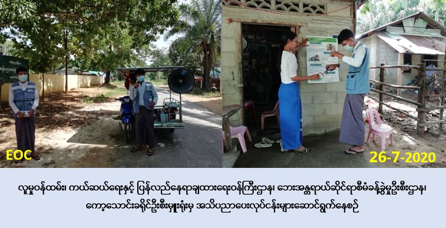 လူမှုဝန်ထမ်း၊ ကယ်ဆယ်ရေးနှင့် ပြန်လည်နေရာချထားရေးဝန်ကြီးဌာန၊ ဘေးအန္တရာယ်ဆိုင်ရာ စီမံခန့်ခွဲမှုဦးစီးဌာန၊ ကော့သောင်းခရိုင်ဦးစီးမှူးရုံးမှ တာဝန်ရှိသူများသည် (၂၆-၇-၂၀၂၀) ရက်နေ့ တွင် ကော့သောင်းခရိုင်၊ ကော့သောင်းမြို့၊ ပါဆယ်ပါညန်းကျေးရွာအတွင်းရှိ ပြည်သူများအား မိုးရာသီကာလအတွင်း ဖြစ်ပေါ်နိုင်သော သဘာဝဘေးအန္တရာယ်များနှင့် ပက်သက်၍ ဆောင်ရန်/ ရှောင်ရန်များ၊ covid-19 ရောဂါနှင့် ပက်သက်၍ အသိပညာပေးခြင်းများကို လော်စပီကာ၊ Hand Speaker ဖြင့် လိုက်လံဆော်သြခြင်းများ ဆောင်ရွက်ခဲ့ကြောင်း သတင်းရရှိပါသည်။