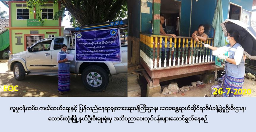 လူမှုဝန်ထမ်း၊ ကယ်ဆယ်ရေးနှင့် ပြန်လည်နေရာချထားရေးဝန်ကြီးဌာန၊ ဘေးအန္တရာယ်ဆိုင်ရာ စီမံခန့်ခွဲမှုဦးစီးဌာန၊ လောင်းလုံးမြို့နယ်ဦးစီးမှူးရုံးမှ တာဝန်ရှိသူများသည် (၂၆-၇-၂၀၂၀) ရက်နေ့၊ နံနက်(၀၈:၀၀)နာရီချိန်မှ နေ့လည်(၁၃:၀၀)နာရီချိန်အထိ လောင်းလုံးမြို့နယ်၊ အောက်ကျောက် ဝပ်ကျေးရွာအုပ်စုအတွင်းရှိ အောက်ကျောက်ဝပ်ကျေးရွာနှင့် ညောပြင်ကျေးရွာများမှ ပြည်သူများ အား COVID-19 ကူးစက်ရောဂါ ပြန့်ပွားမှုများ မဖြစ်ပွားစေရန်အတွက် သိရှိလိုက်နာရမည့် အချက်များနှင့် မိုးရာသီကာလအတွင်း ဖြစ်ပွားတက်သော သဘာဝဘေးအန္တရာယ်များဖြစ်သည့် မြေပြိုဘေး၊ ရေဘေး၊ မိုးကြိုးဘေး၊ လေပြင်းဘေးများနှင့် စပ်လျဉ်း၍ ဆောင်ရန်/ရှောင်ရန် အချက်များအား အသိပညာပေးဆောင်ရွက်ခဲ့ပြီး လက်ကမ်းစာစောင်များ ဖြန့်ဝေပေးခြင်းနှင့် မုန်တိုင်းဘေးဗီနိုင်းပိုစတာများ ပေးအပ်ခြင်းများ ဆောင်ရွက်ခဲ့ကြောင်း သတင်းရရှိပါသည်။