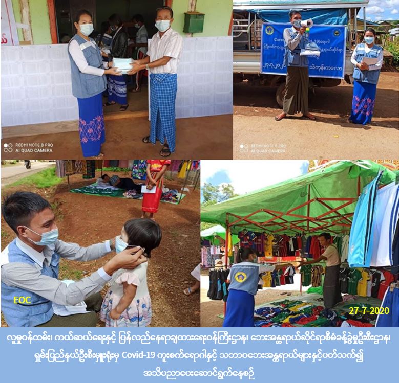လူမှုဝန်ထမ်း၊ ကယ်ဆယ်ရေးနှင့် ပြန်လည်နေရာချထားရေးဝန်ကြီးဌာန၊ ဘေးအန္တရာယ်ဆိုင်ရာစီမံခန့်ခွဲမှုဦးစီးဌာန၊ ရှမ်းပြည်နယ်ဦးစီးမှူးရုံးမှ တာဝန်ရှိသူများသည် (၂၇-၇-၂၀၂၀) ရက်နေ့တွင် ရှမ်းပြည်နယ်အစိုးရအဖွဲ့၏ ကြီးကြပ်မှုဖြင့် ကလောမြို့နယ်၊ သဲကုန်းကျေးရွာနှင့် ကျောက်ထပ်ကျေးရွာတို့၌ Covid-19 ကူးစက်ရောဂါကြိုတင်ကာကွယ်ရေးအသိပညာပေးခြင်းနှင့် သဘာဝဘေးဆိုင်ရာ အသိပညာပေးခြင်းများ Hand Speaker များဖြင့် လိုက်လံဟောပြောခြင်း၊ Mask နှင့် အသိပညာပေးလက်ကမ်းစာစောင်များ ပေးဝေခြင်းတို့အား ဆောင်ရွက်ခဲ့ပါကြောင်း သတင်းရရှိပါသည်။