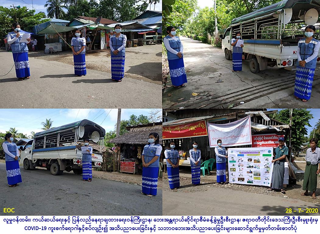 လူမှုဝန်ထမ်း၊ ကယ်ဆယ်ရေးနှင့်ပြန်လည်နေရာချထားရေးဝန်ကြီးဌာန၊ ဘေးအန္တရာယ်ဆိုင်ရာစီမံခန့်ခွဲမှုဦးစီးဌာန၊ ဧရာဝတီတိုင်း ဒေသကြီးဦးစီးမှူးရုံးမှ တာဝန်ရှိသူများသည် (၂၈-၇-၂၀၂၀) ရက်နေ့၊ (ဝ၉:ဝ၀) နာရီအချိန်မှစ၍ ပုသိမ်ခရိုင်၊ ကန်ကြီးထောင့်မြိို့နယ်၊ ရှမ်းရွာကျေးရွာအုပ်စု၊ အမှတ်(၁)ရပ်ကွက်၊ အမှတ်(၂)ရပ်ကွက်၊ အမှတ်(၃)ရပ်ကွက်၊ အမှတ်(၄)ရပ်ကွက်၊ အမှတ်(၅)ရပ်ကွက်၊ အမှတ်(၆)ရပ်ကွက်နှင့် အမှတ်(၇)ရပ်ကွက် တို့တွင် ကျန်းမာရေးနှင့်အားကစားဝန်ကြီးဌာနမှ ထုတ်ပြန်ထားသော Covid-19 ကူးစက်မှု ဒုတိယလှိုင်းမဖြစ်စေရန် အသိပညာပေးခြင်း လုပ်ငန်းများနှင့် ဧရာဝတီတိုင်းဒေသကြီး Covid -19 ထိန်းချုပ်ရေးနှင့် အရေးပေါ်တုံ့ပြန်ရေးကော်မတီမှ (၁၄-၇-၂၀၂၀) ရက်နေ့အထိ ထုတ်ပြန်ပြီးဖြစ်သည့် တားမြစ်မိန့်နှင့် ညွှန်ကြားချက်များအား လည်းကောင်း၊ ရာသီအလိုက်ဖြစ်ပွားတတ်သော သဘာဝဘေးအန္တရာယ်များနှင့်ပတ်သက်သည့် သဘာဝဘေးအသိပညာပေးခြင်း တို့အားလည်းကောင်း၊ အများပြည်သူများသိရှိလိုက်နာရန် ကွင်းဆင်းလှည့်လှည်၍ အသိပညာပေးလုပ်ငန်းများဆောင်ရွက်ခဲ့ပါ ကြောင်း သတင်းရရှိပါသည်။